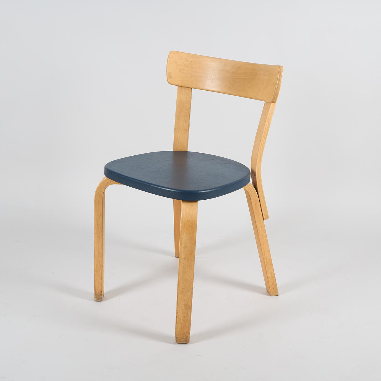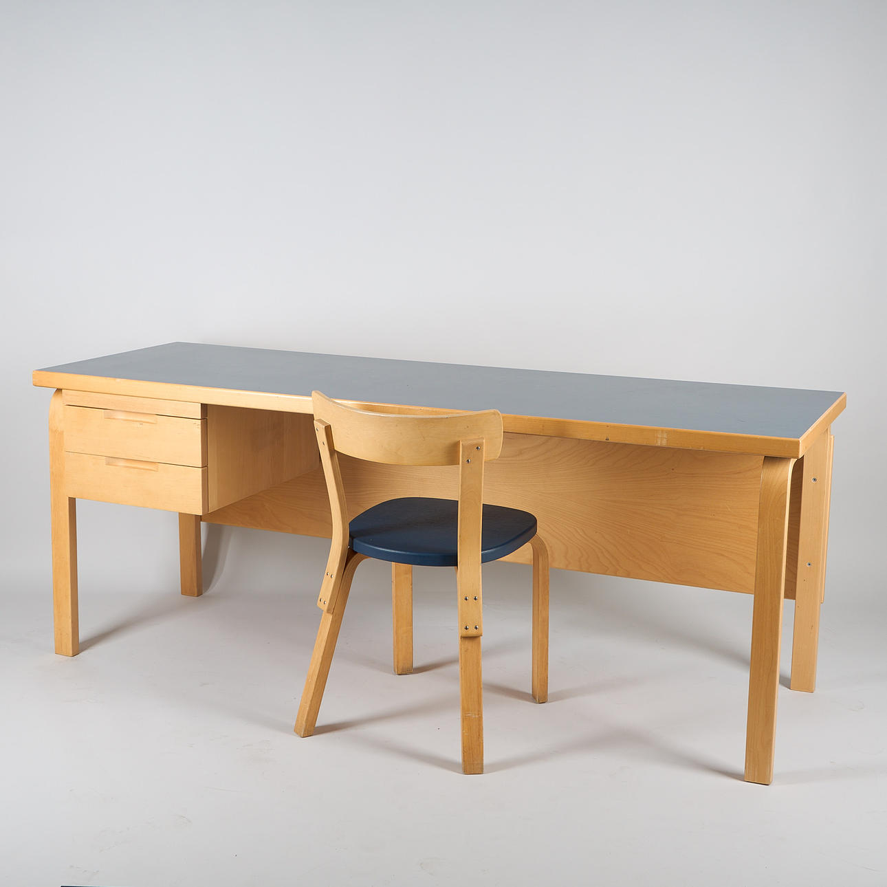 Rare extra-large birch desk with gray-blue linoleum top, designed by Alvar Aalto. Features two drawers and a beautifully paneled backside in birch, allowing it to be placed freely in a room. The craftsmanship and proportions reflect Aalto’s timeless balance between function and form. Matching birch chair with blue seat is included. A rare find, especially in this extended size.
