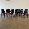 Rare set of 8 Danish modern dining chairs designed by Arne Hovmand-Olsen for Onsild Møbelfabrik, 1960s. Model 75 features elegant sculpted teak frames with tapered legs and curved backs, paired with black skai upholstered seats and backs. Brass fasteners subtly accent the construction. The set includes 6 side chairs and 2 armchairs.