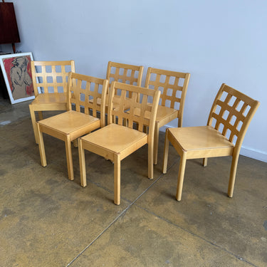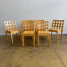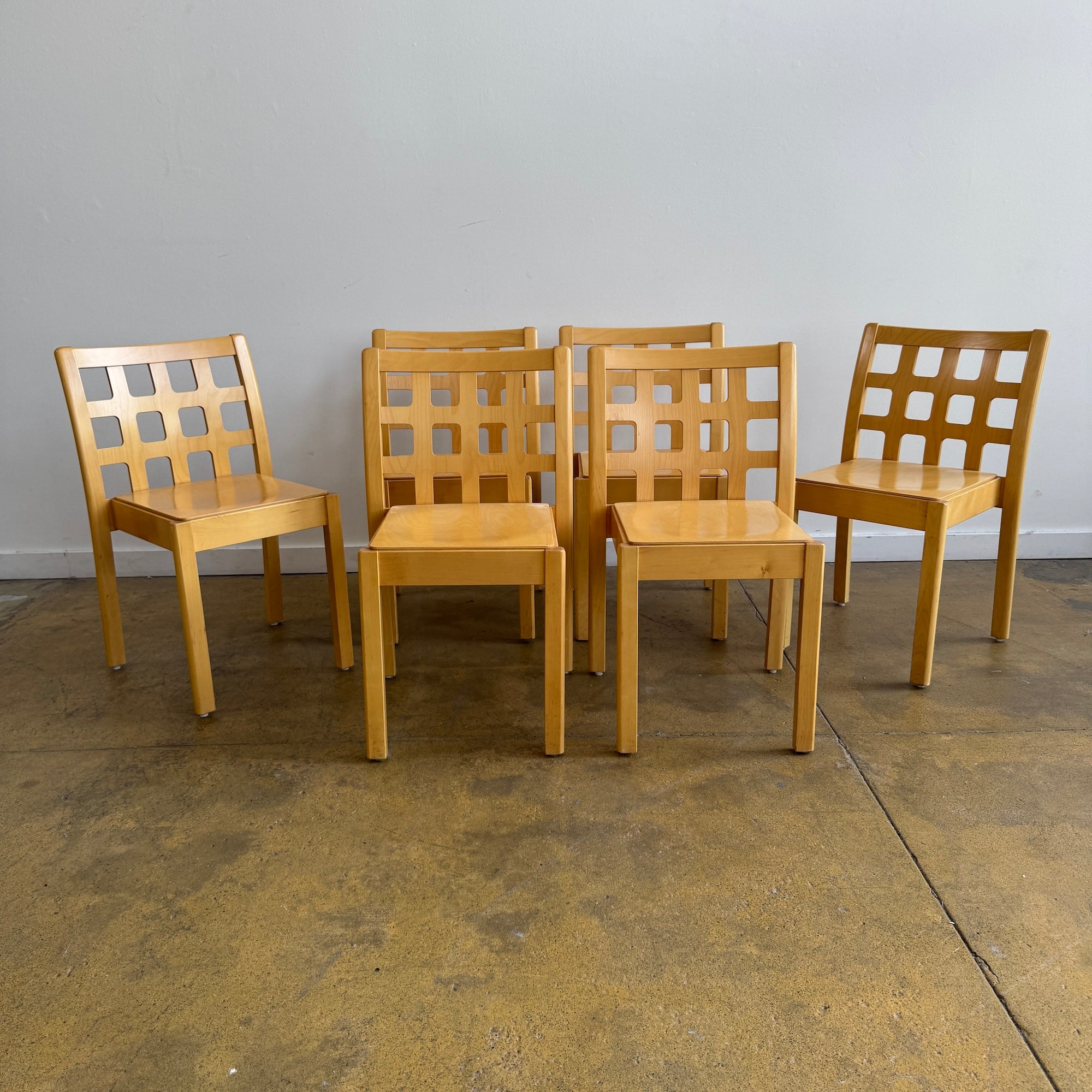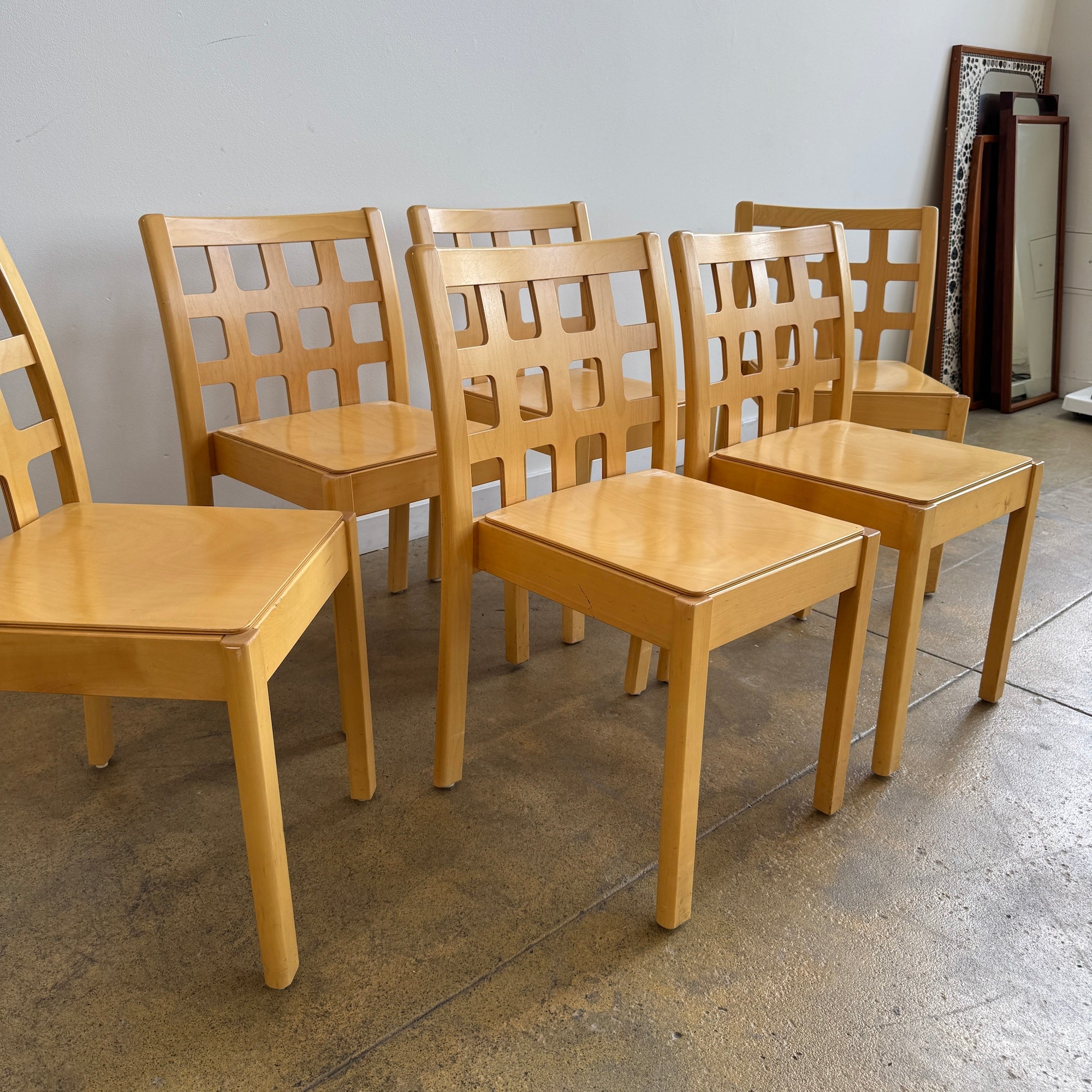 Rare set of six dining chairs designed by Finnish designer Eero Aarnio and produced by Asko. Known as the “Ruuto” chair, these feature a distinctive square-grid backrest crafted in solid birch with a warm natural finish. Aarnio’s playful yet functional design language is evident here—sculptural, minimal, and highly architectural.