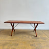This surfboard teak coffee table, designed in the style of Hans Wegner, is in excellent condition with no stains or damage. It has been lightly refinished, preserving its natural beauty.