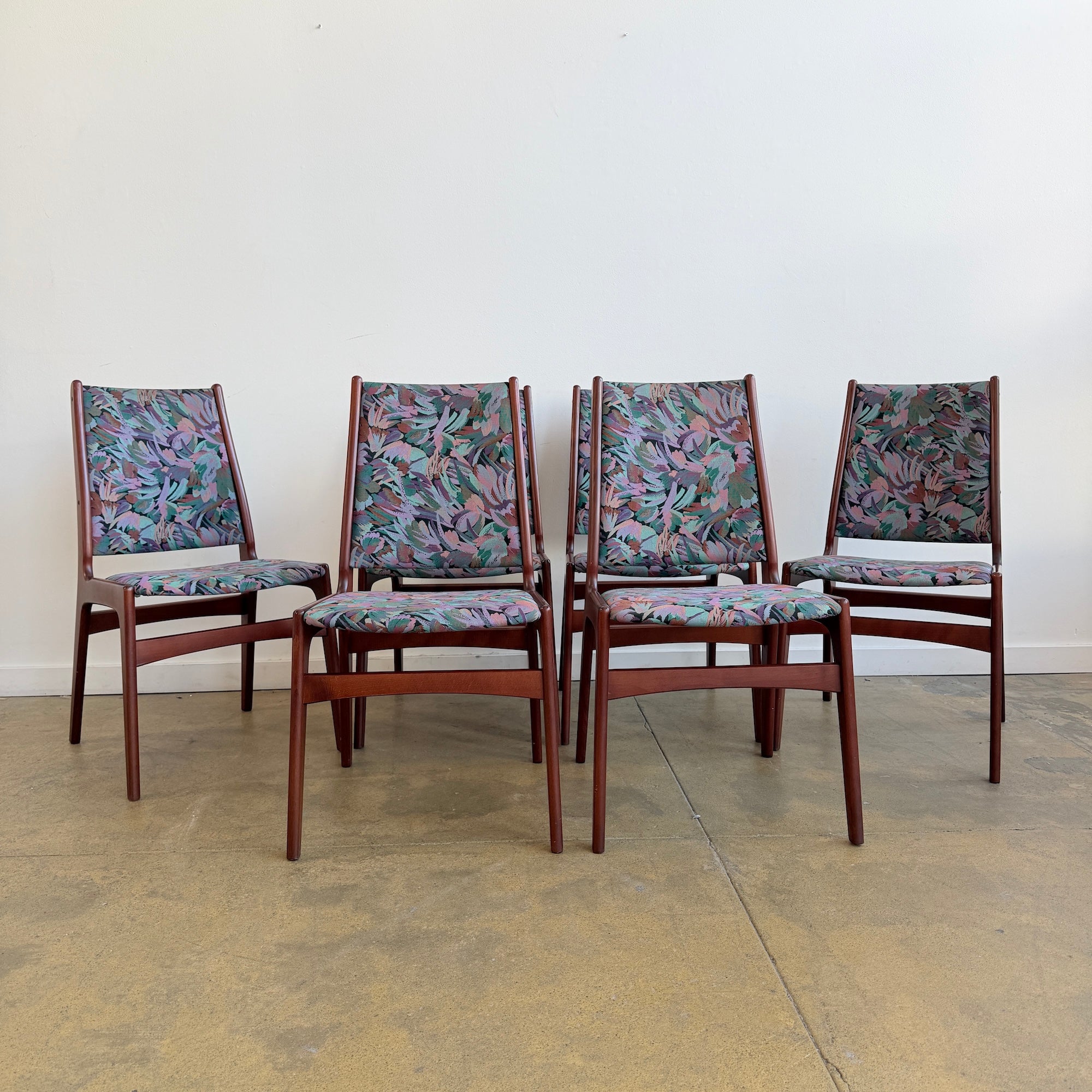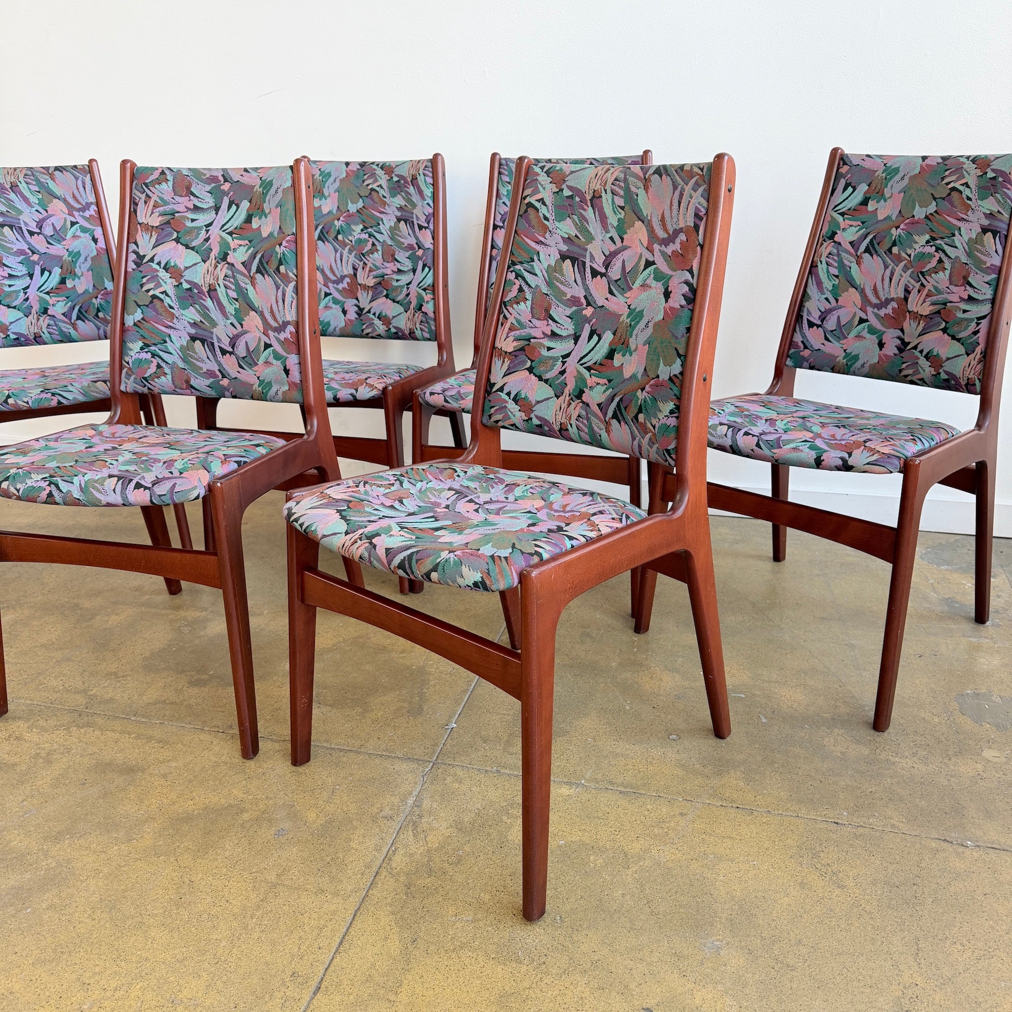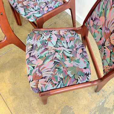 Danish modern dining chairs designed by Johannes Andersen for Uldum Møbelfabrik, featuring elegant sculpted frames finished in a warm rosewood stain. The chairs showcase Andersen’s refined approach to proportion and comfort, with gently tapered legs, angled backrests, and a light, architectural presence.