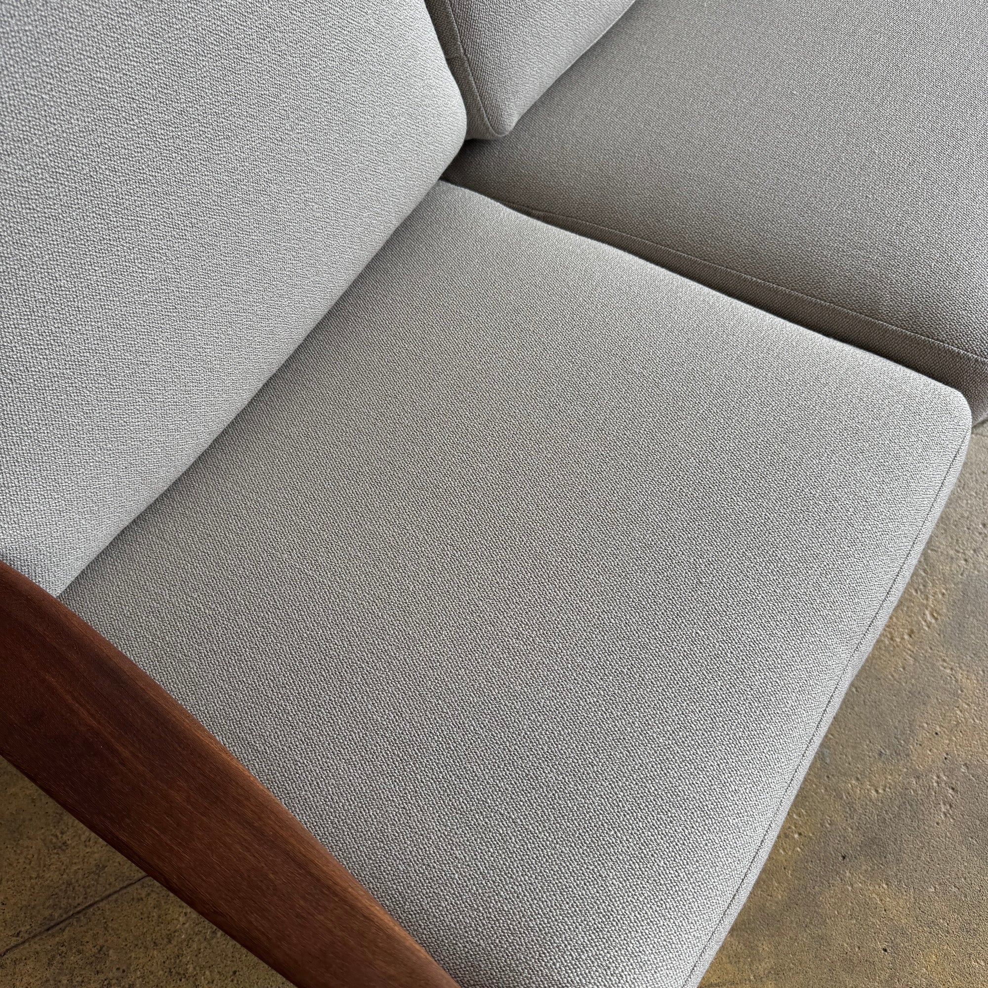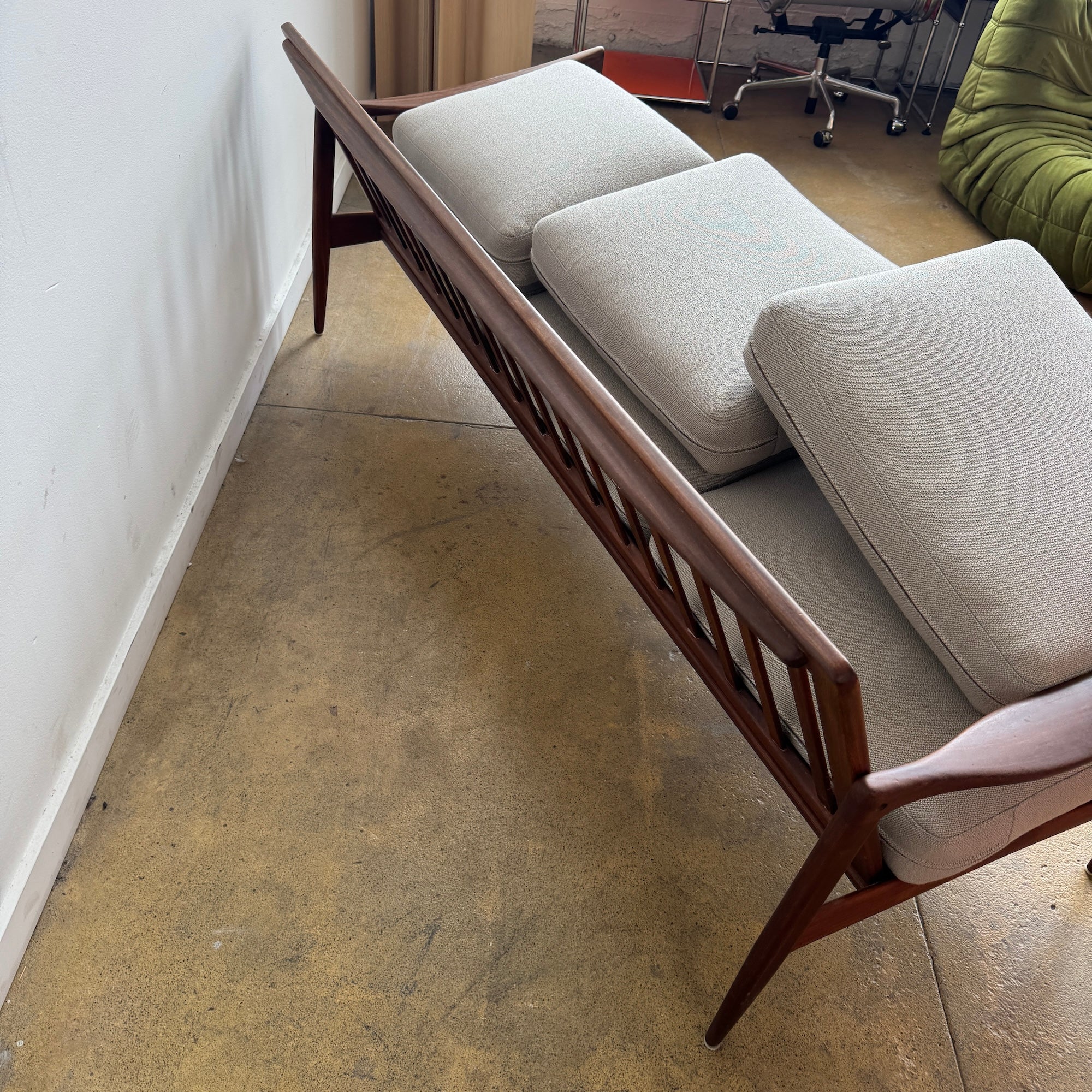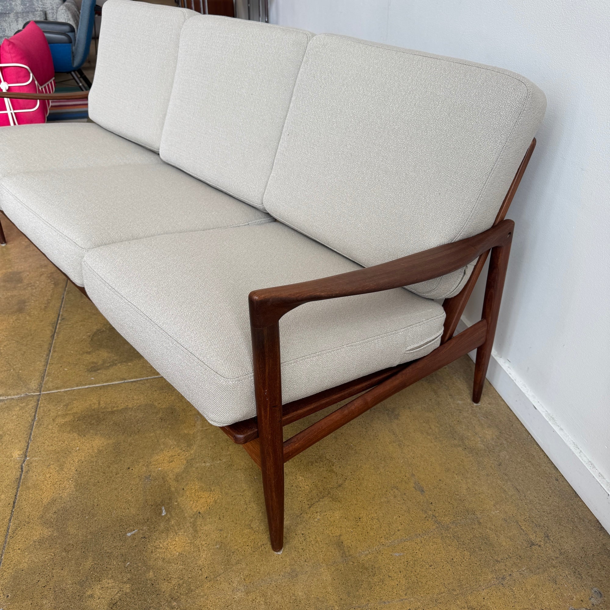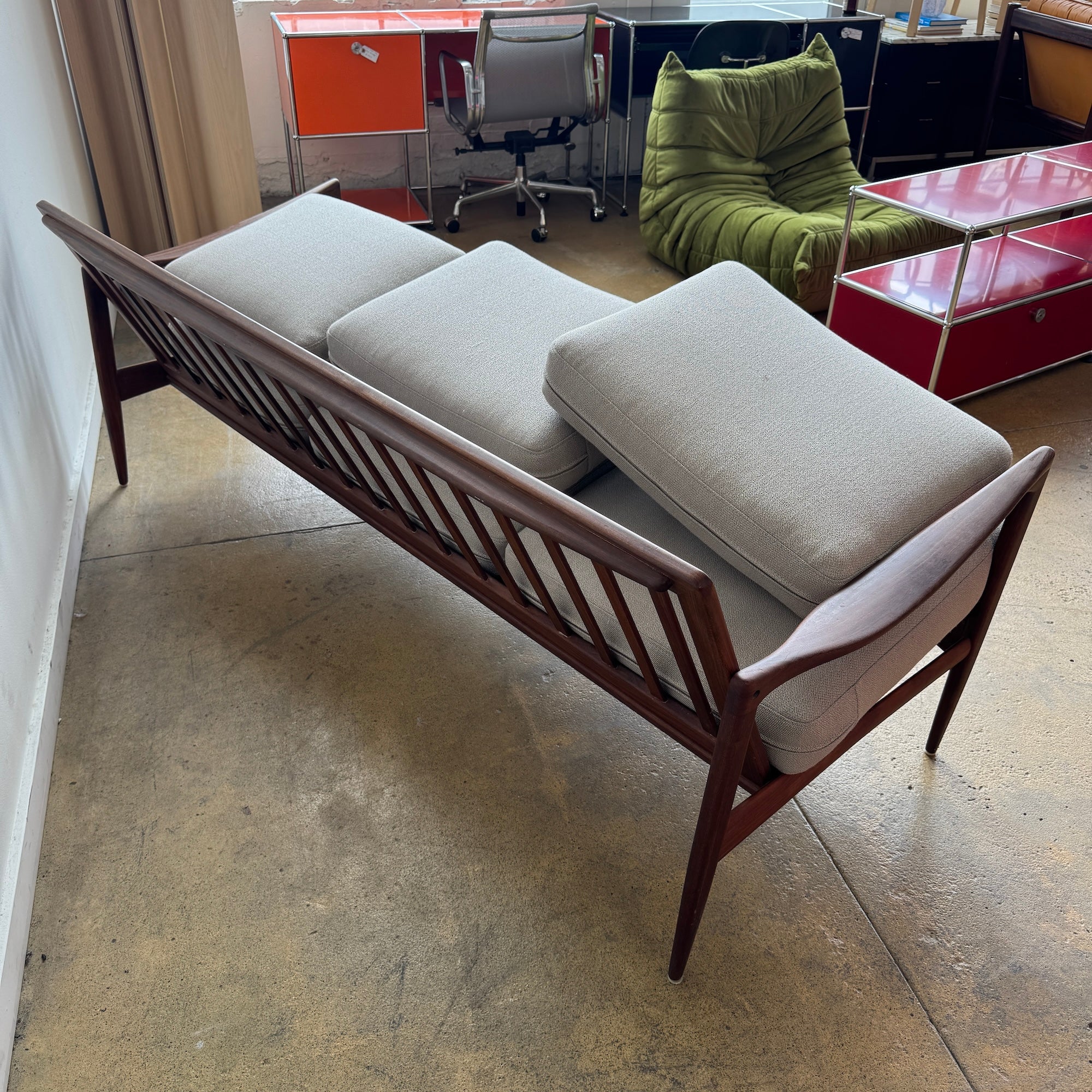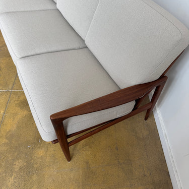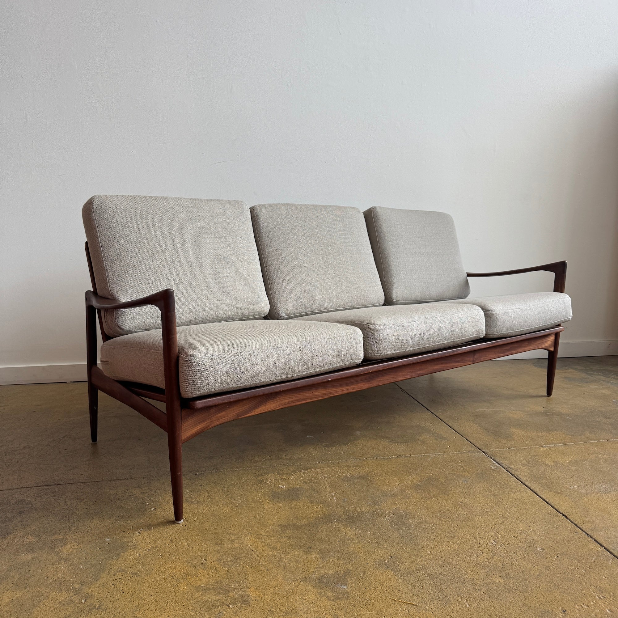 Danish modern three-seat sofa designed by Ib Kofod-Larsen for Selig. Featuring a sculptural solid wood frame with refined lines and tapered legs, this piece exemplifies the elegance of Scandinavian design. Recently reupholstered with new cushions and foam for lasting comfort. Frame is in excellent vintage condition with minor scuffs from age.
