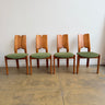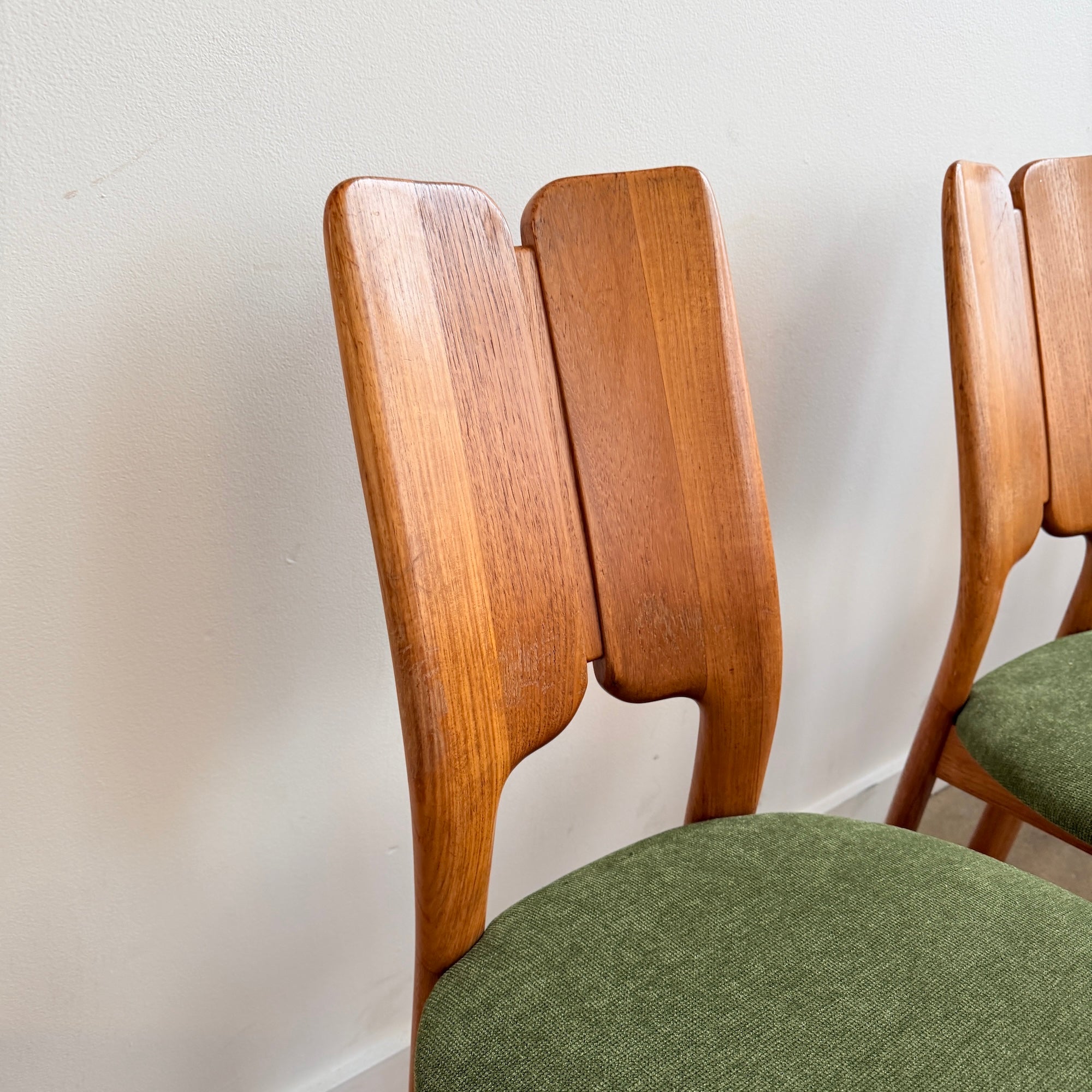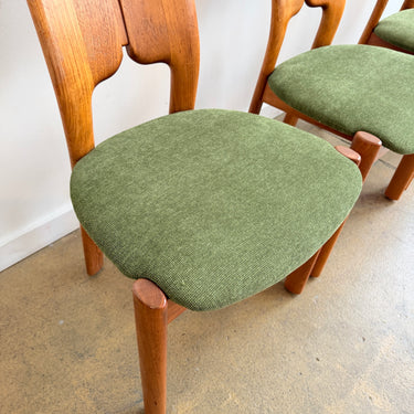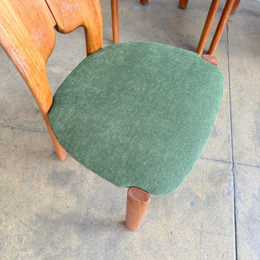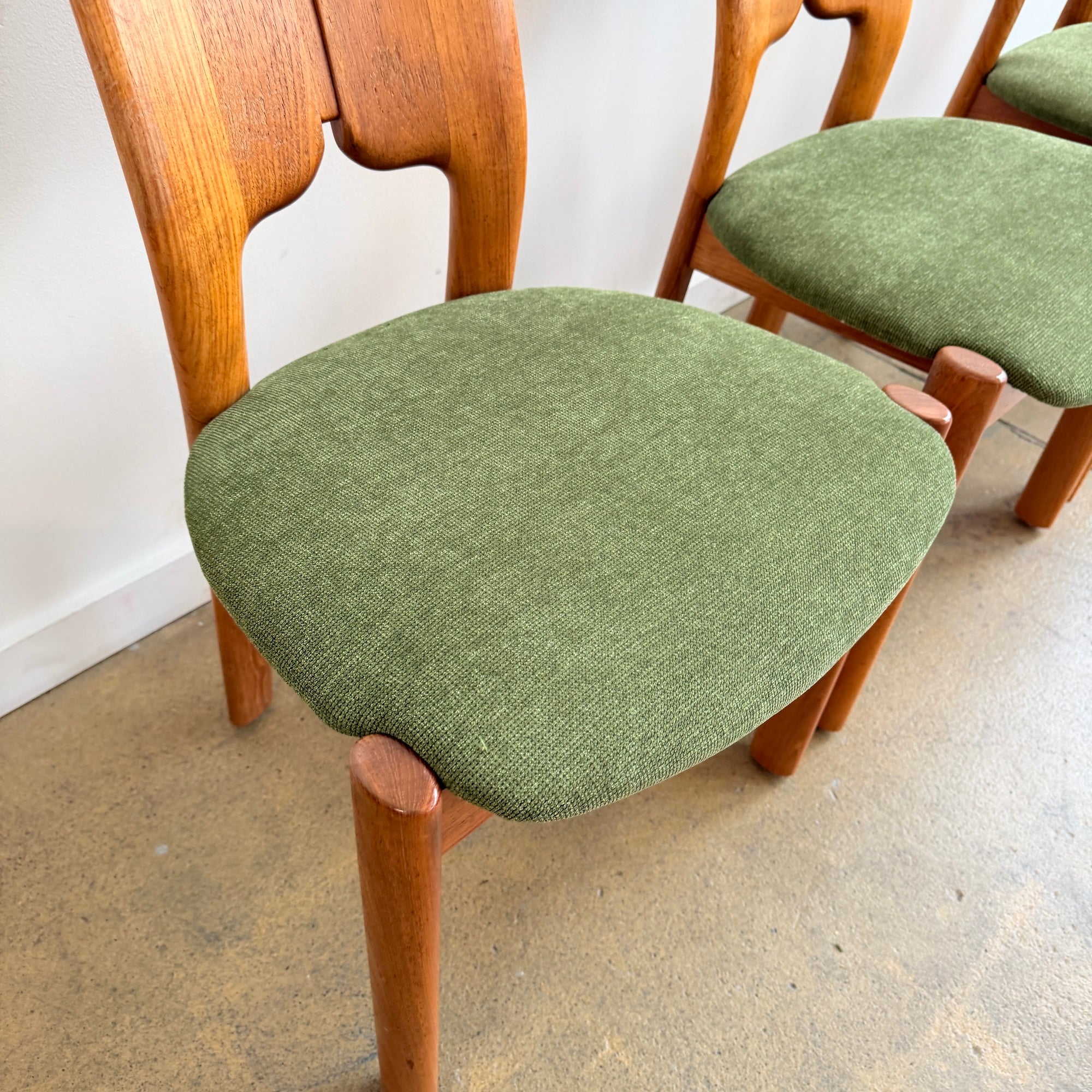 The chairs are in good overall condition and have been newly upholstered in a durable green performance chenille fabric that offers subtle texture and a comfortable sit for everyday use, while the teak frames present well with only minor, age-appropriate wear.