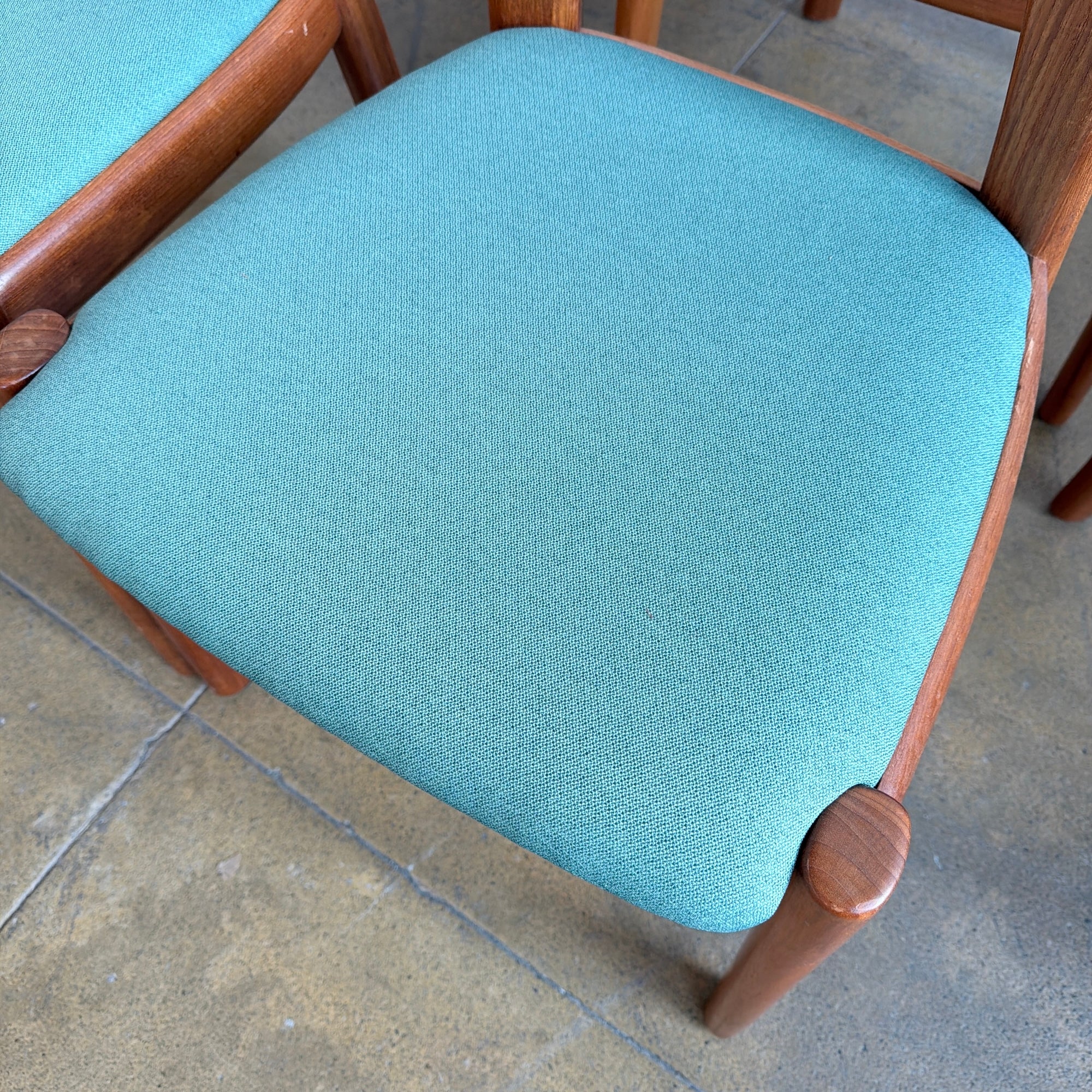 This chair, designed by Danish designer Niels Kofoed in 1957, features a minimalist and timeless design that remains as modern today as when it was first created. The frame is crafted from solid teak, showcasing a sculptural and elegant form. The chair is cleaned and upholstered in Maharam green fabric.