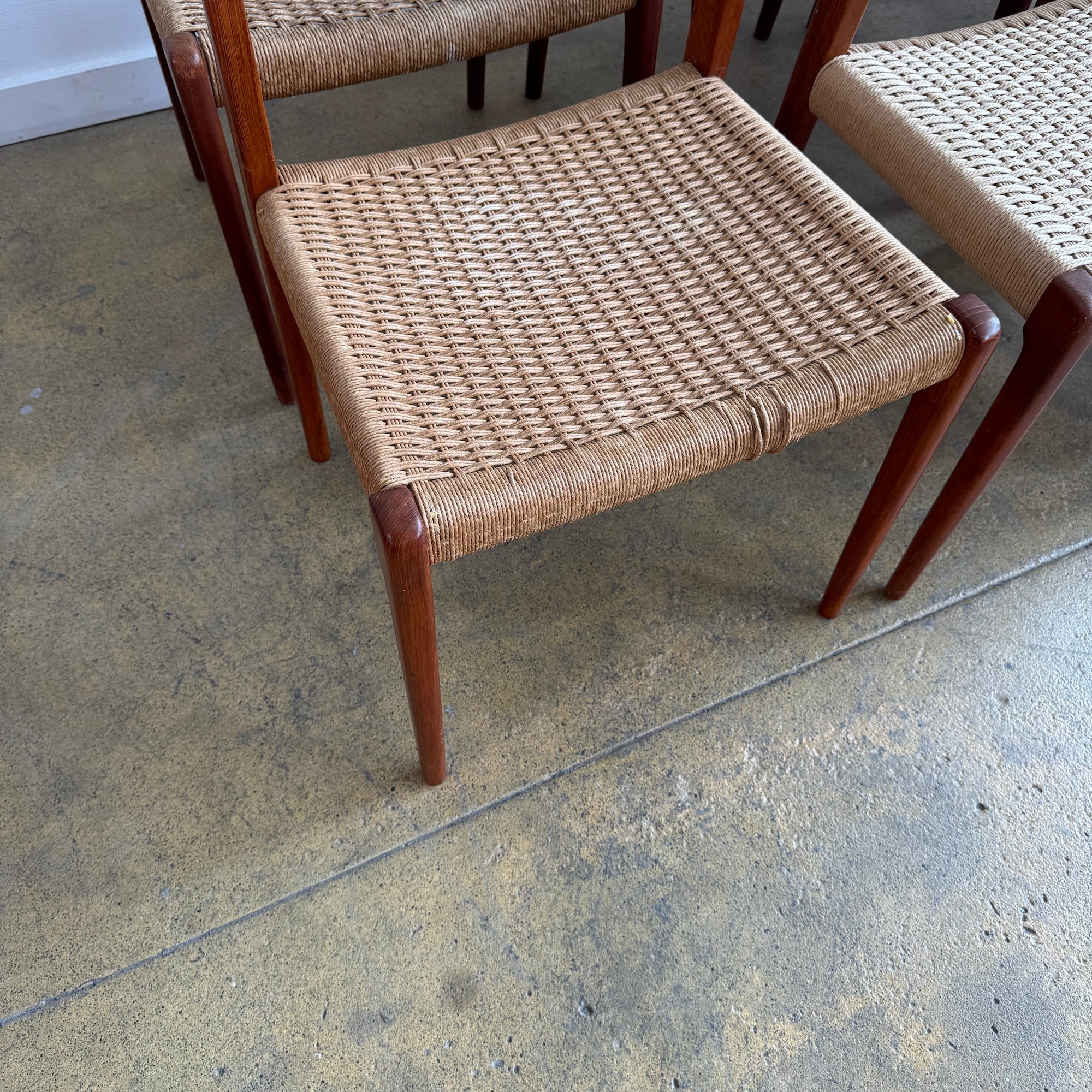 Currently, two of the chairs have been restored. The listed price includes refinishing the frames of all eight chairs and reweaving the seats in traditional Danish paper cord, a process done entirely in-house by our team in Emeryville. Expect a 2–3 week turnaround.