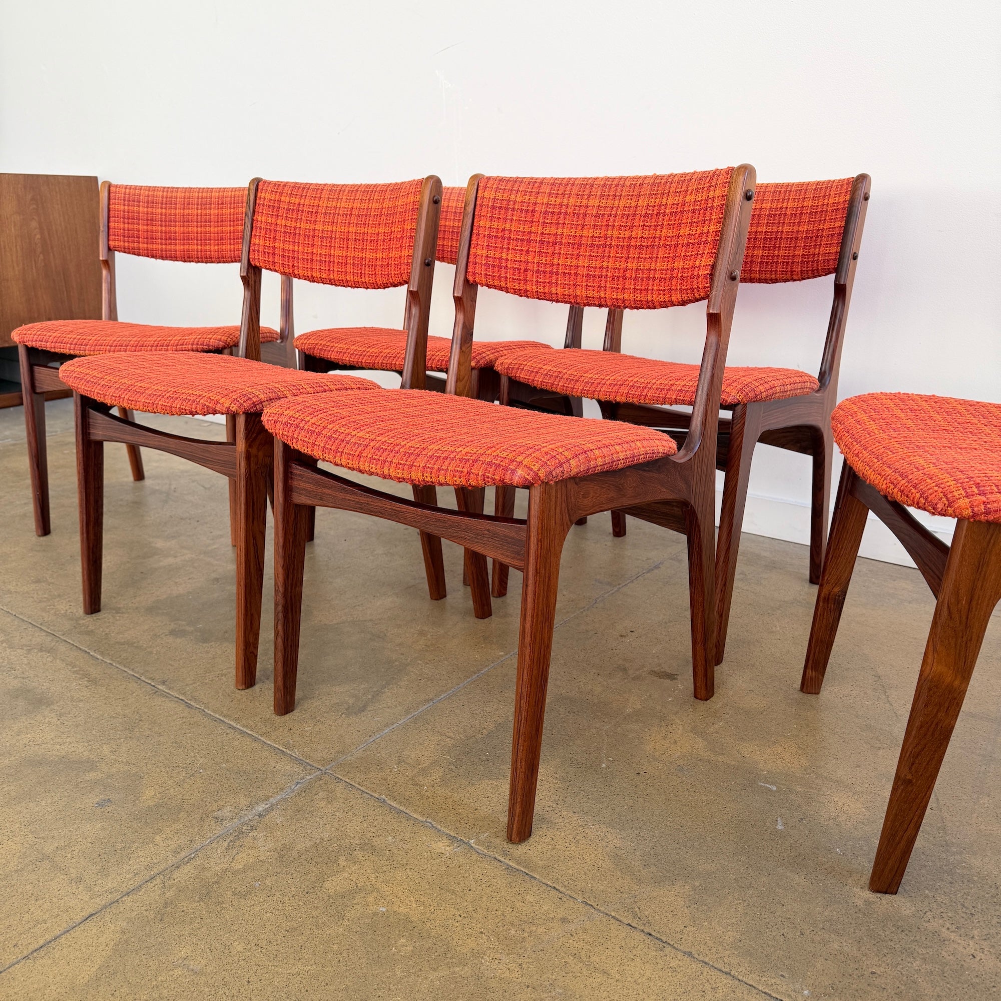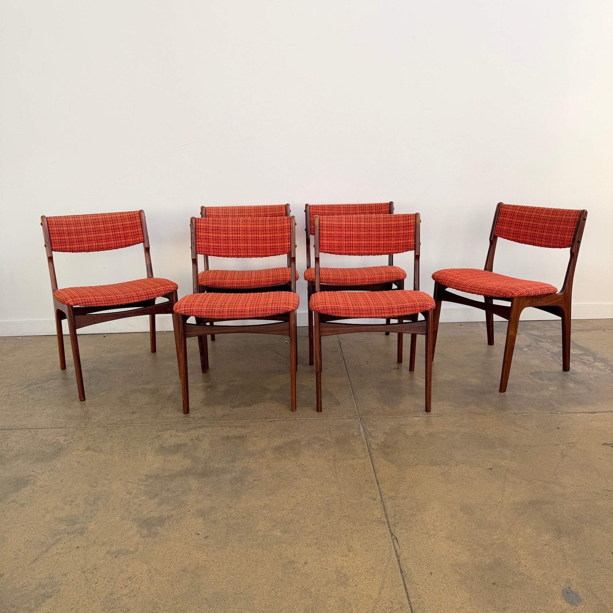 Danish modern rosewood dining chairs by Erik Buch, set of six. Buch’s sculpted frame work is on full display here, with rich rosewood grain, soft curves, and balanced proportions that make his designs so sought after. The set has a warm, cohesive presence and carries that unmistakable Scandinavian lightness and refinement.