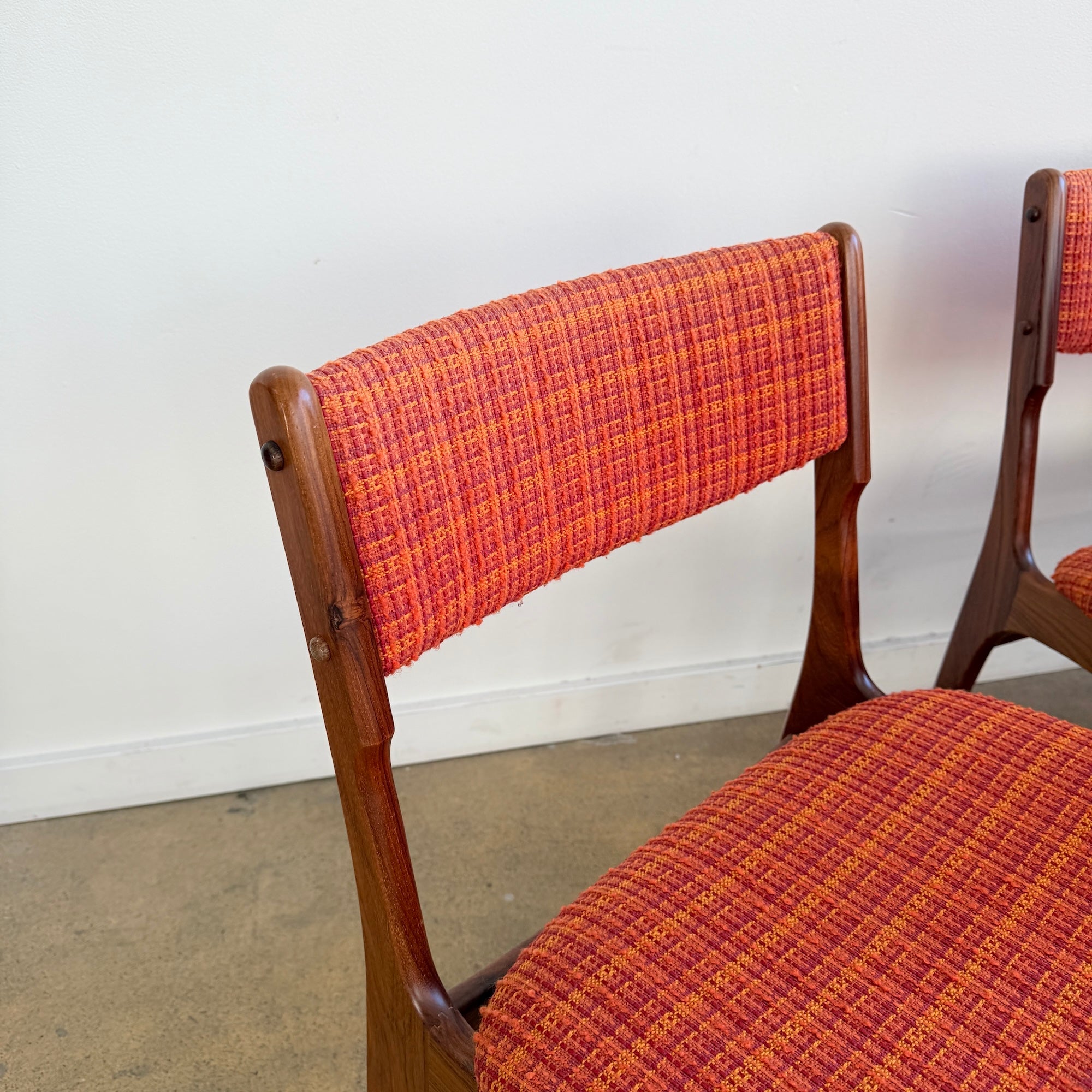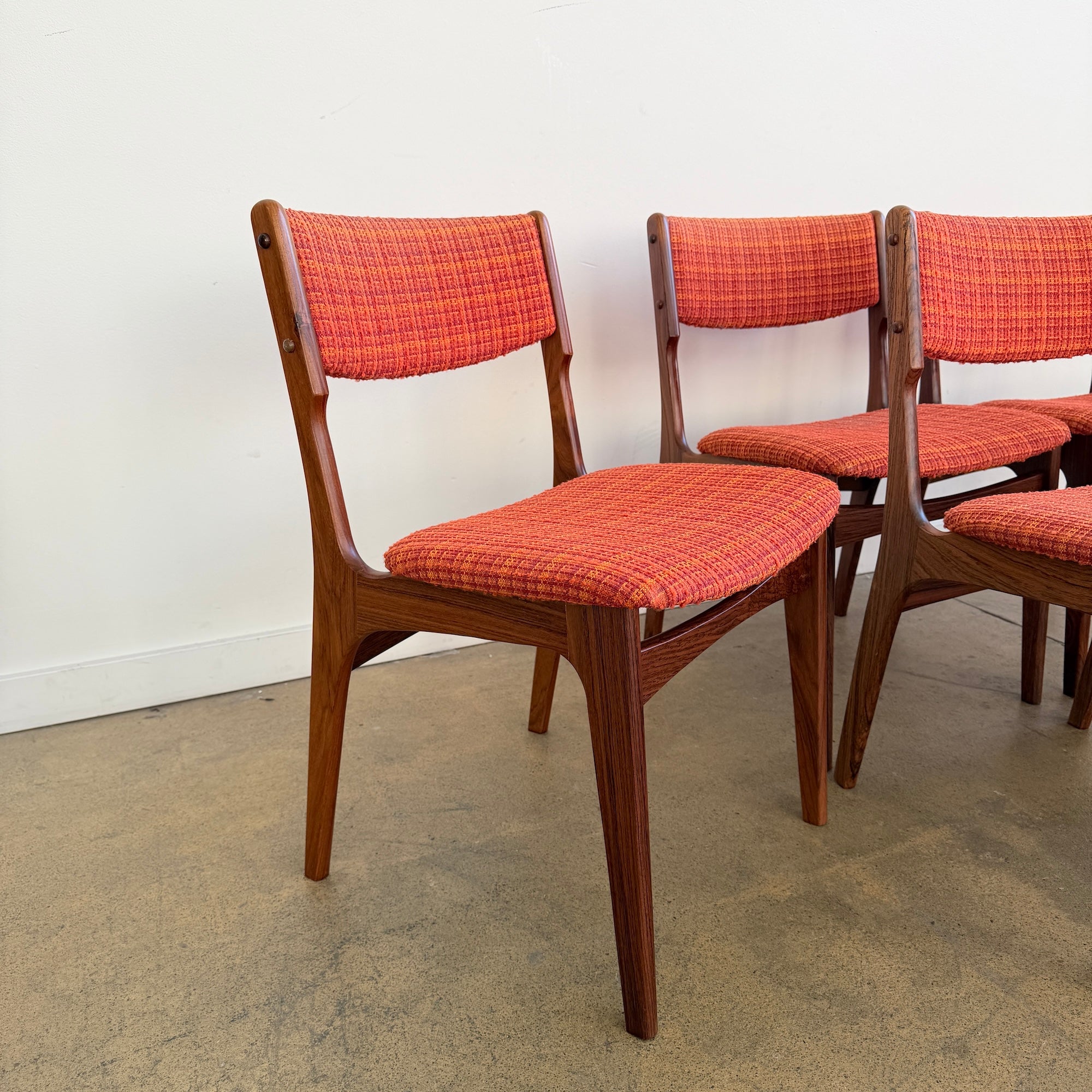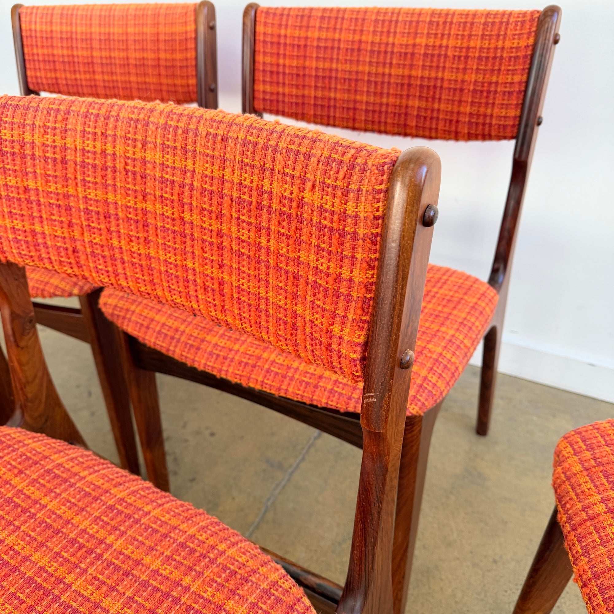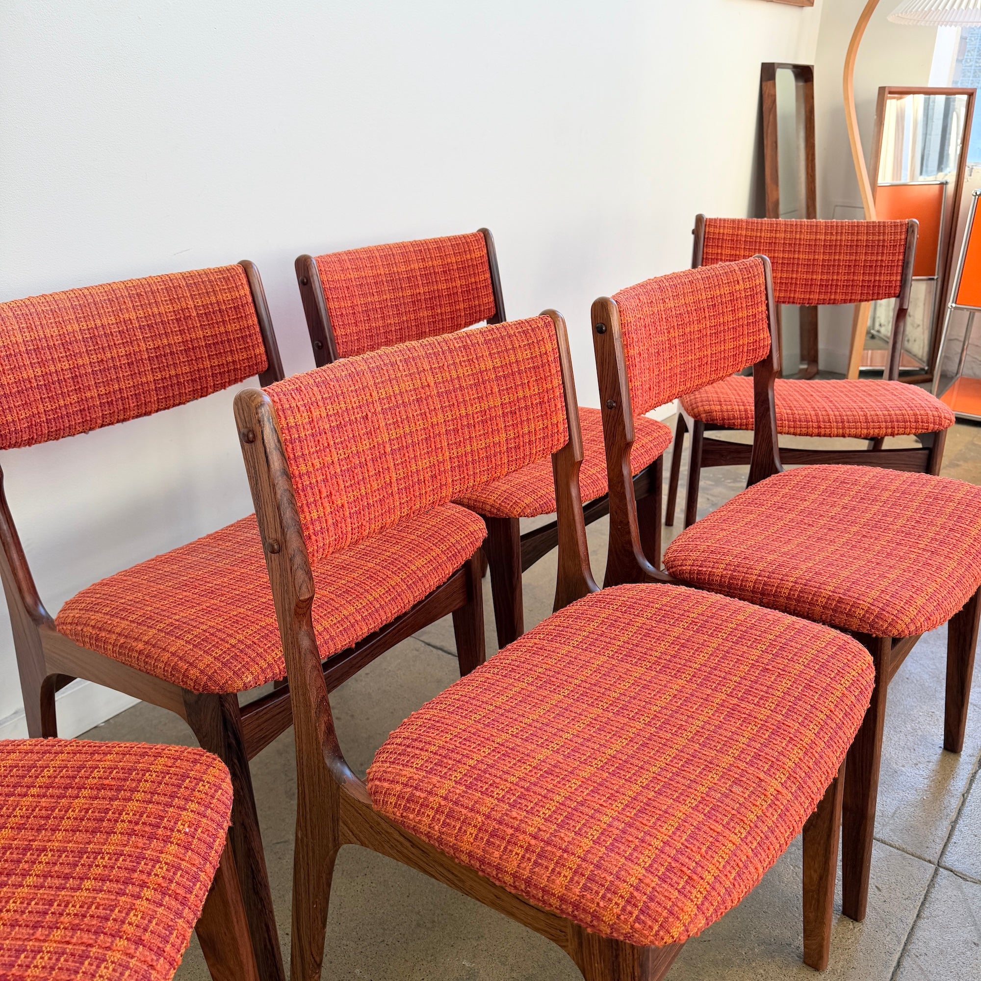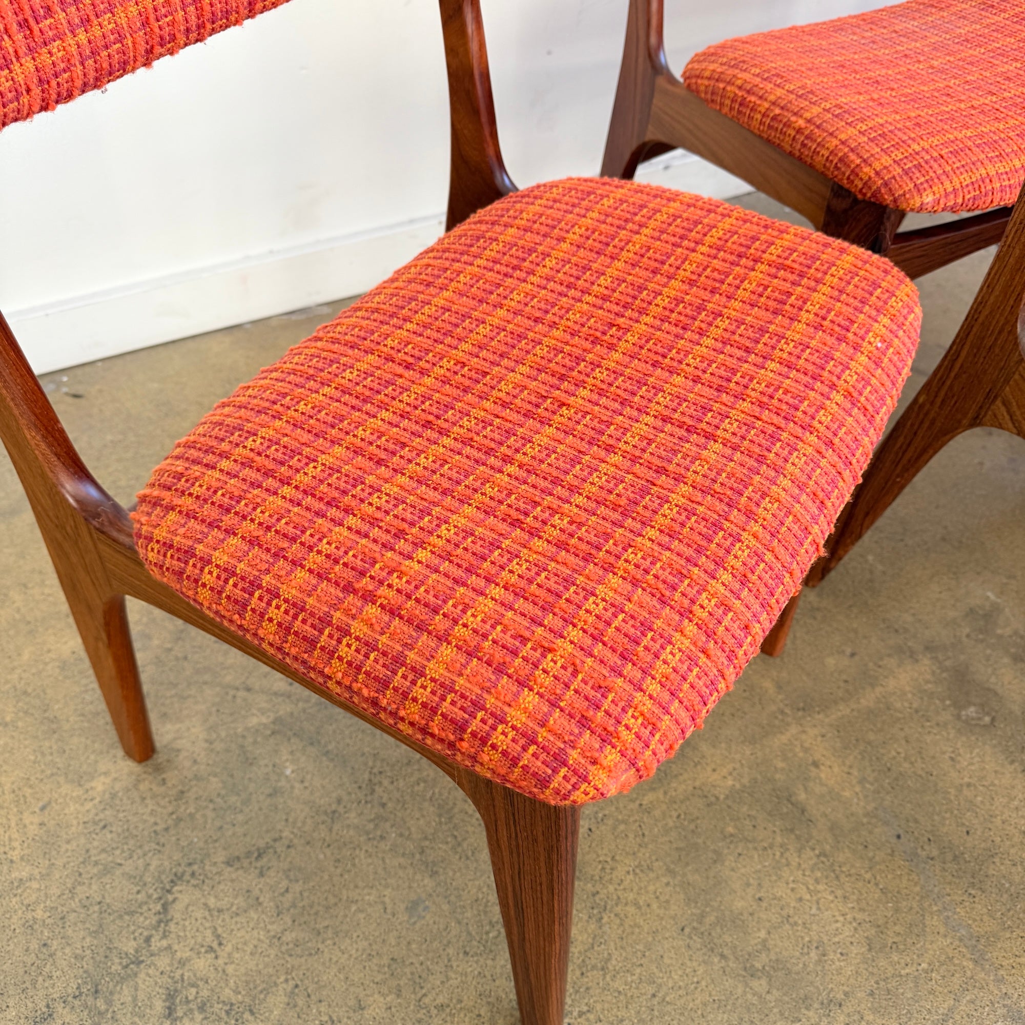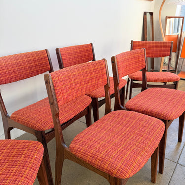All six chairs are in really good vintage condition. We believe they were reupholstered within the last 5–10 years in Denmark in this vibrant orange tweed fabric that fits the mid-century character perfectly. Frames are sturdy, joints are strong, and the upholstery shows very minimal wear.