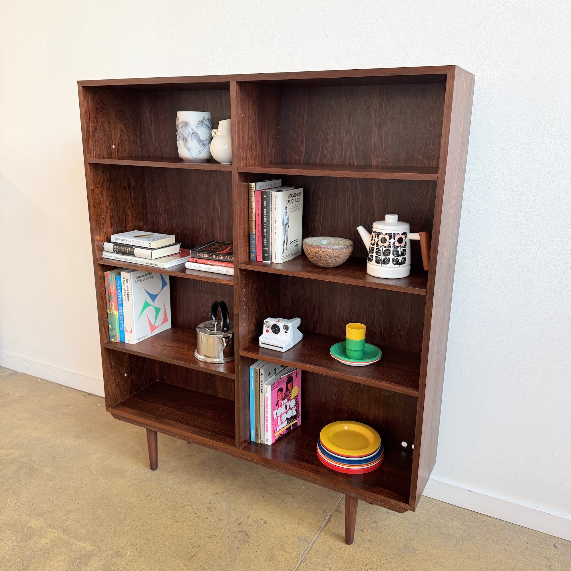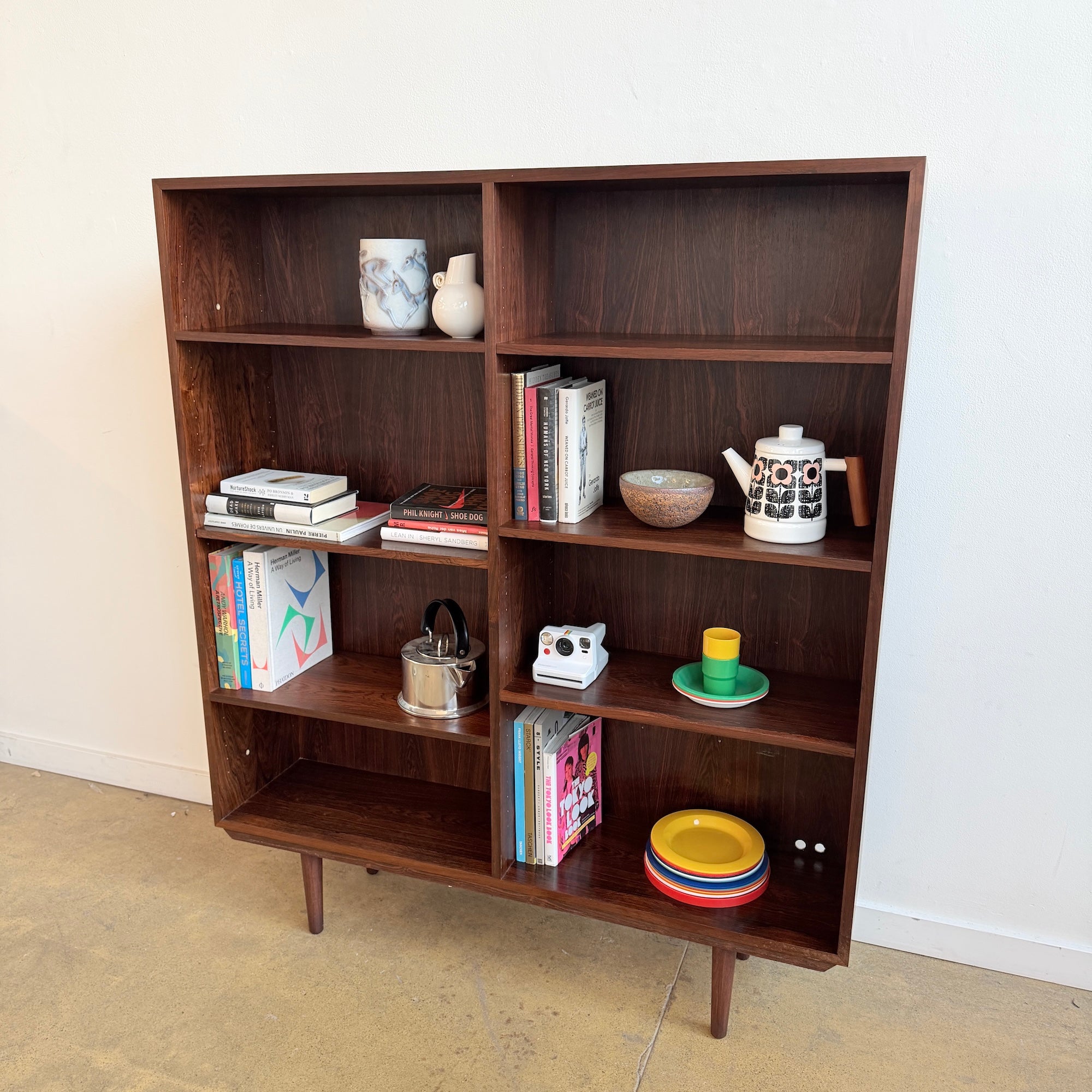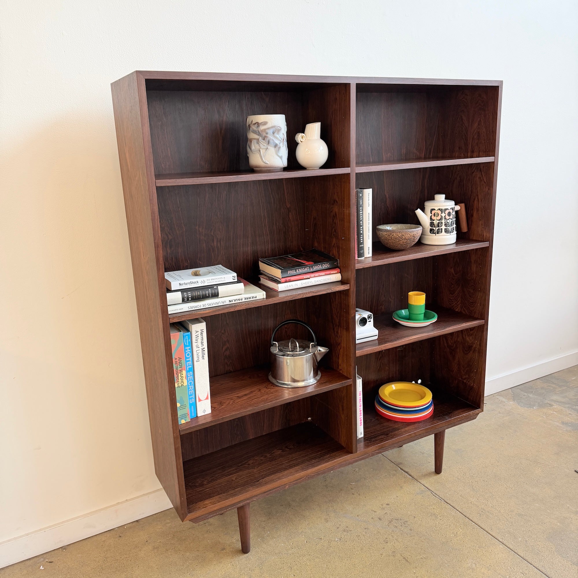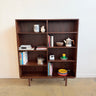 Rosewood bookcase designed by Gunni Omann Jr., Denmark. Features rich grain patterns, clean modern lines, and adjustable shelving throughout. A well-proportioned piece that works equally well for books, ceramics, or display. Light wear consistent with age—some minor scuffs here and there. Structurally solid and visually striking.