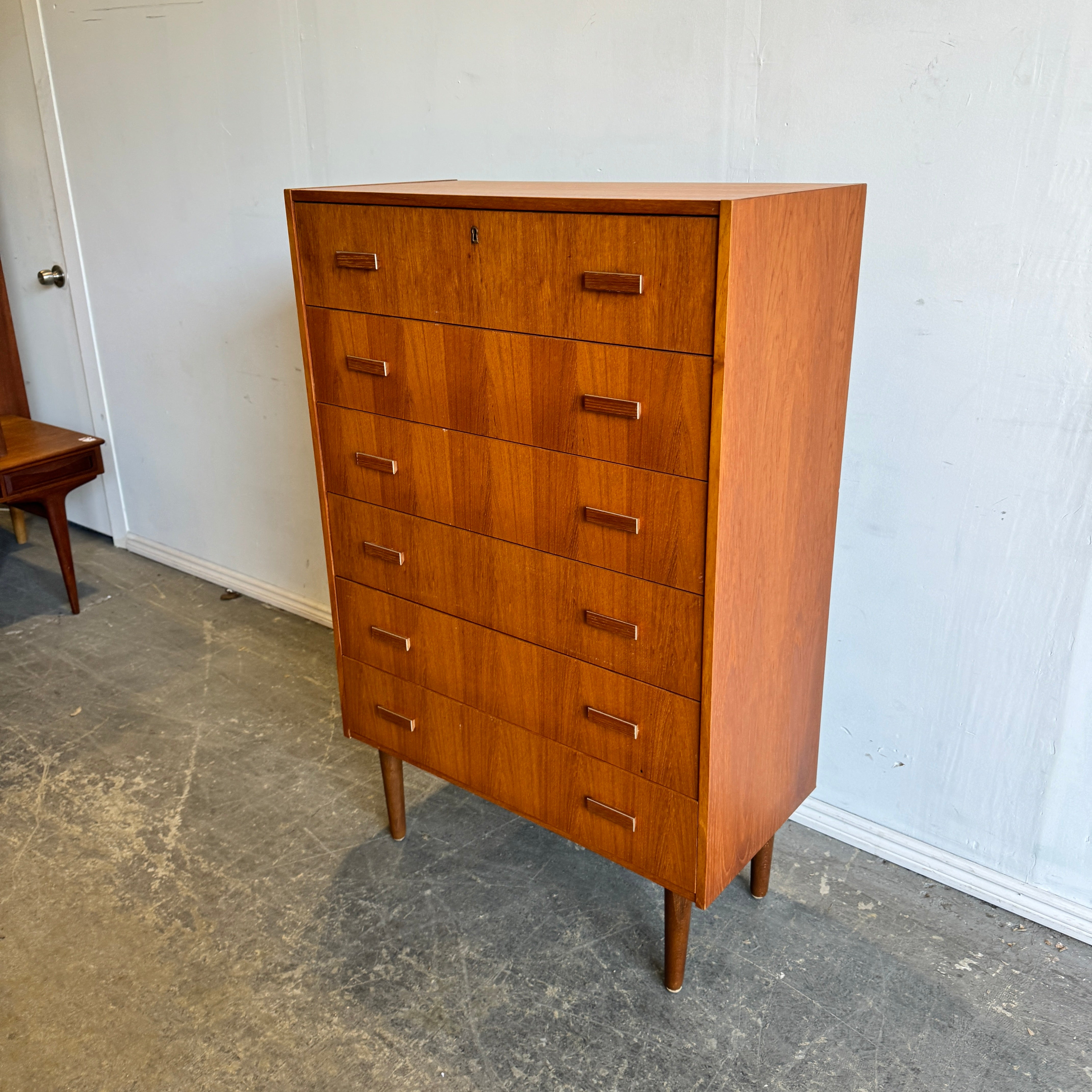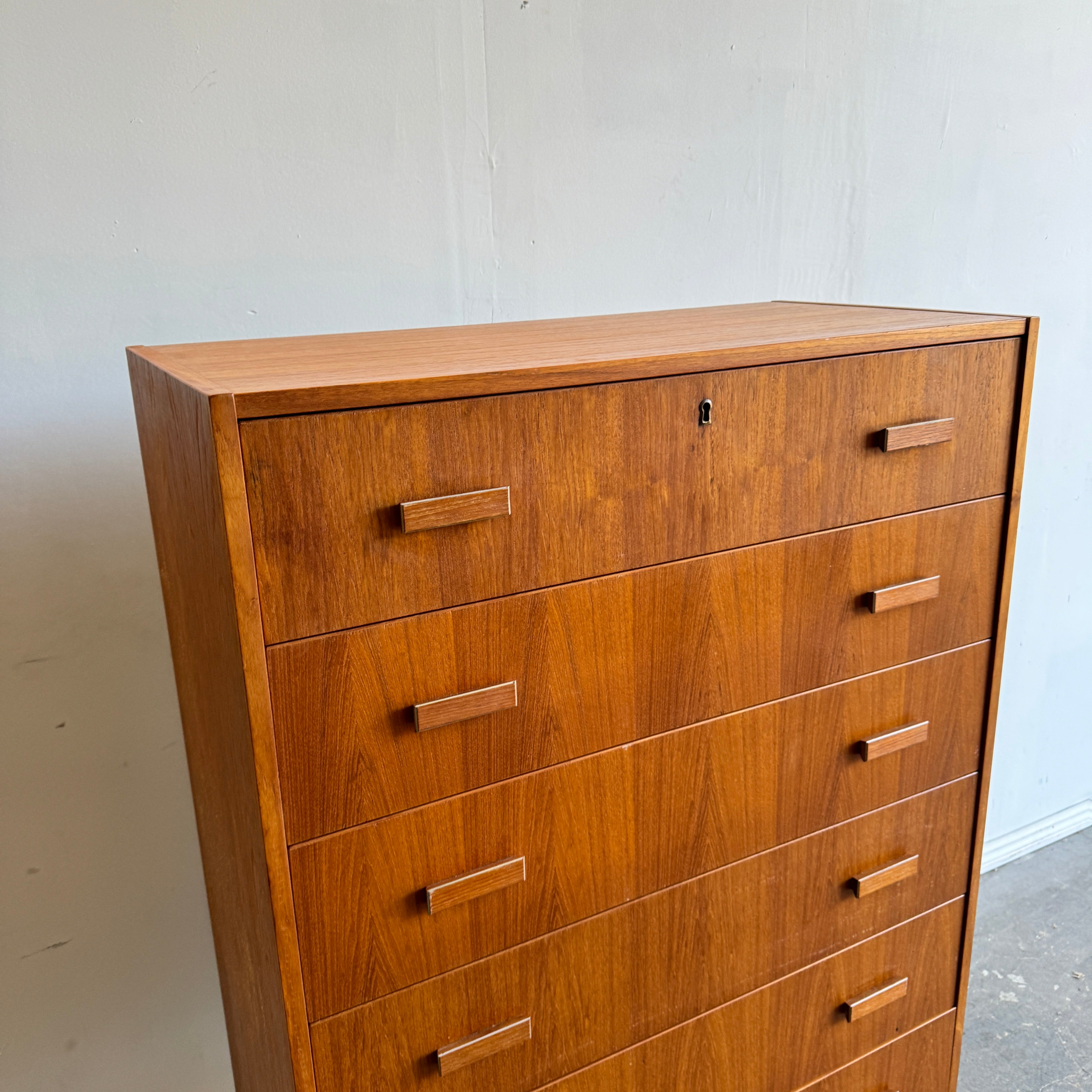 In a good vintage condition teak tall dresser from Denmark. Comes with the key. Some light scuffs appropriate to age. No major damage or stains.