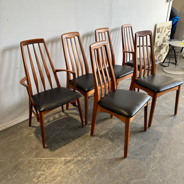 Note: In a good vintage condition set of 6 Eva dining chairs by Niels Koefoed. No damage, stains, or tear. Some wear here and there from age and normal usage. Classic dining chairs model “Eva” from the 1960s. Solid teak frame with the original high-quality leather cover in black. The offer includes 4 side chairs and two armchairs. Recently upholstered.