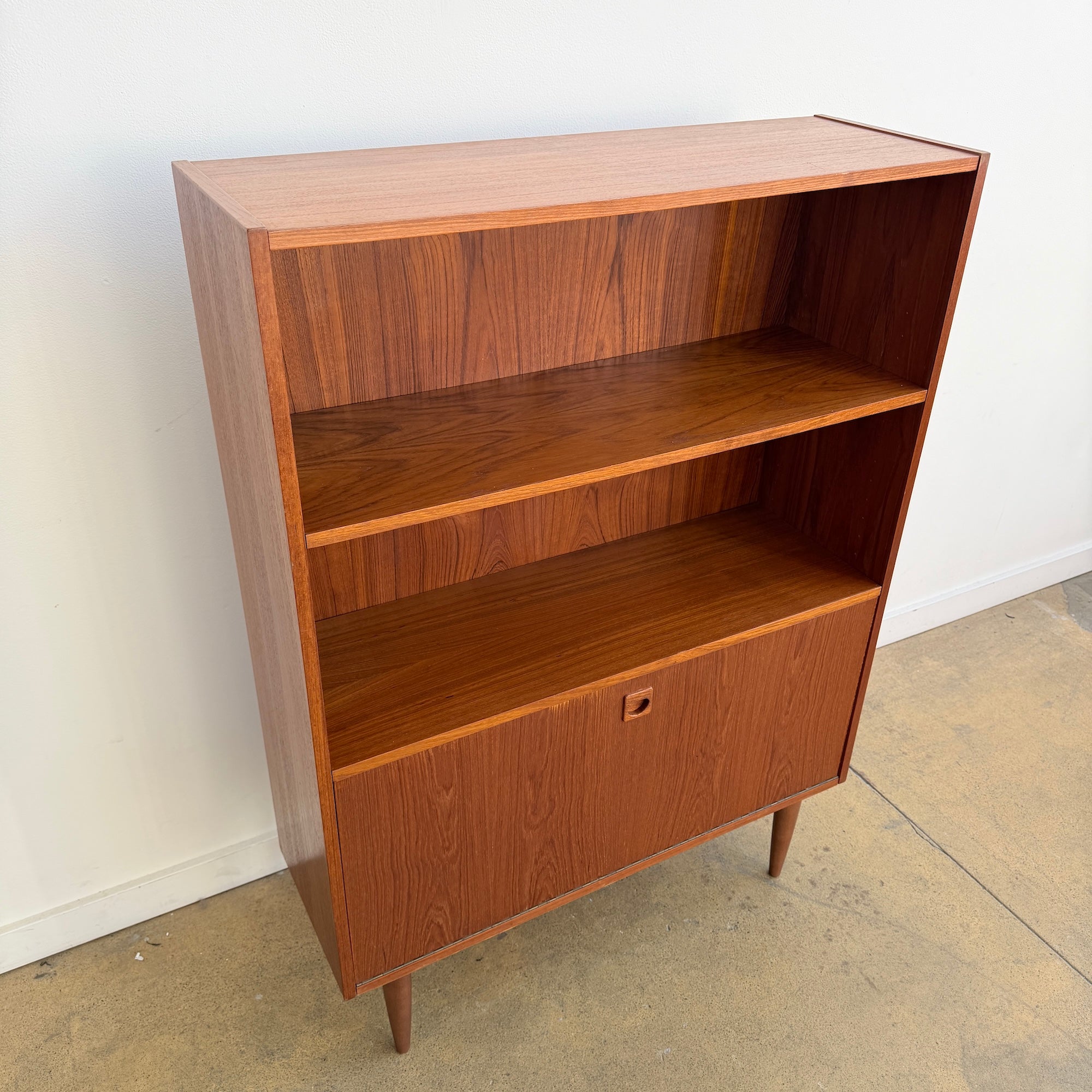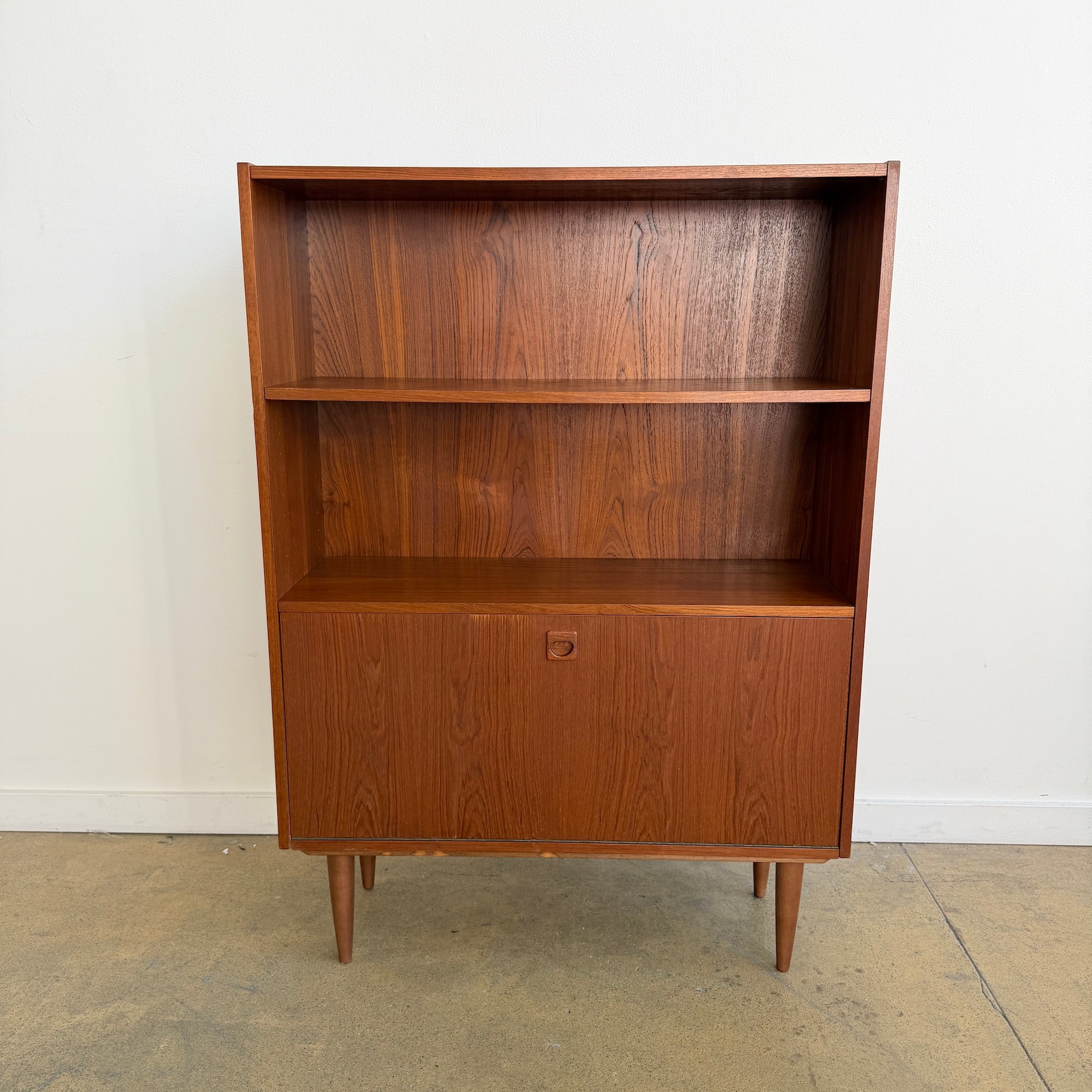 This Danish modern teak bookcase from the 1960s showcases clean Scandinavian lines and warm, expressive teak grain. The design features two open shelves, one adjustable, offering flexible display and storage, along with a lower drop-down door that functions beautifully as a compact secretary or concealed storage. Inside the drop-down compartment is an additional shelf, making the piece both practical and visually balanced. Raised on tapered solid teak legs, it has a light, architectural presence typical of mid-century Danish cabinetry and is attributed to Clausen based on its construction details and proportions. The bookcase is in good vintage condition, with light scuffs and signs of age consistent with use.