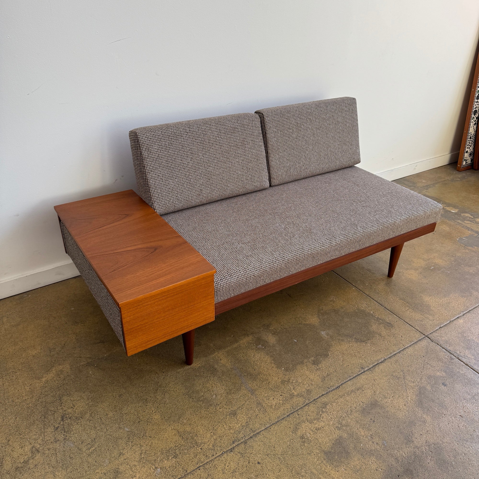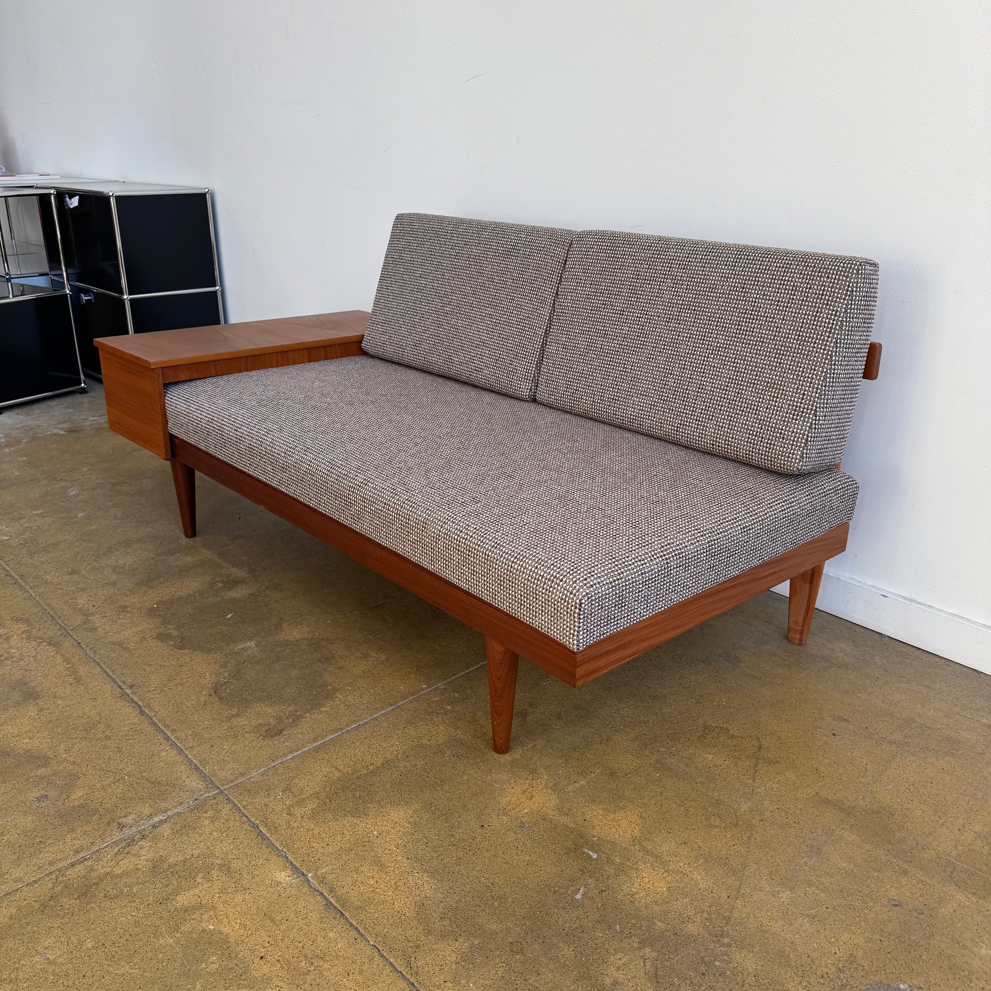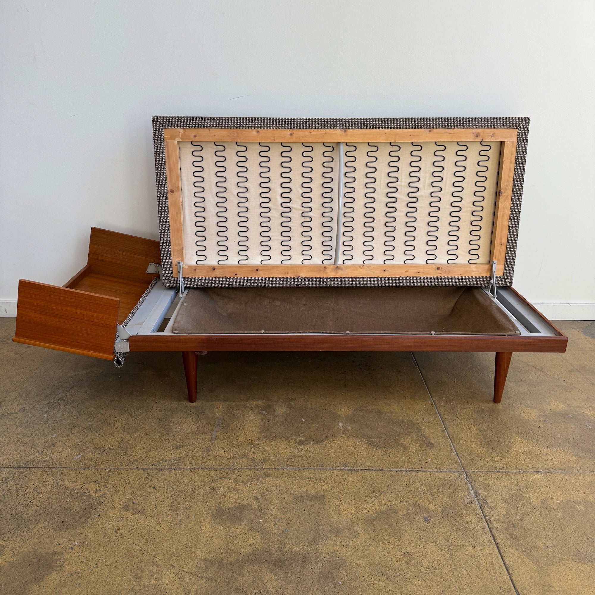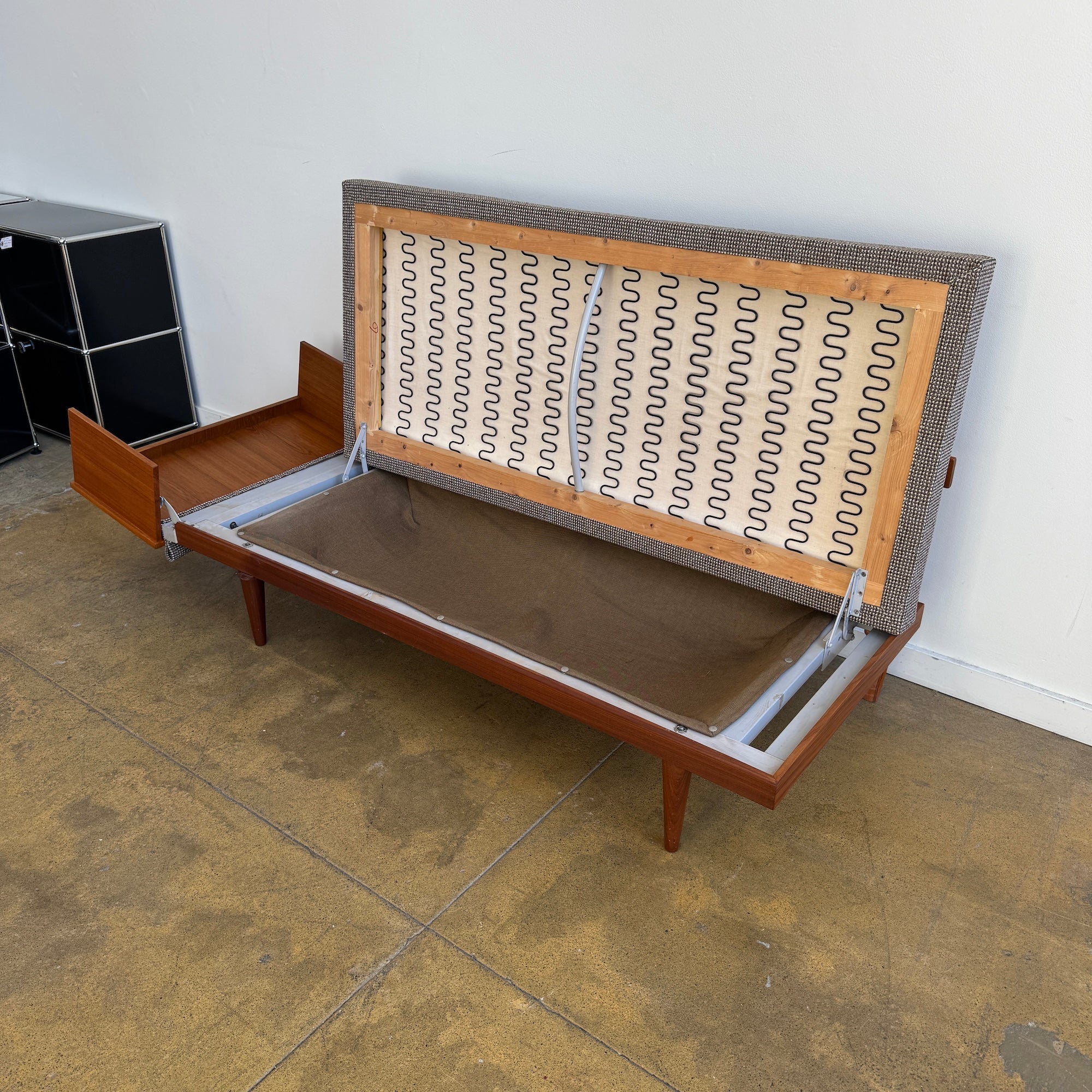 The integrated teak side table has been professionally refinished, showcasing a rich, even grain and warm tone. The daybed also features a clever fold-out mechanism that converts it from a compact sofa into a single bed. Hidden storage beneath the seat provides space for throws or pillows.