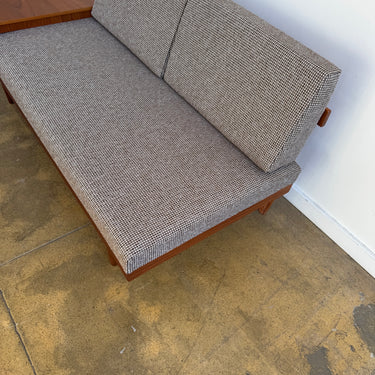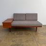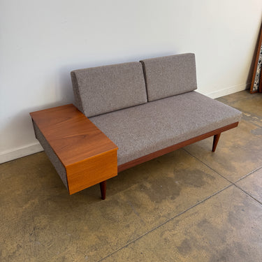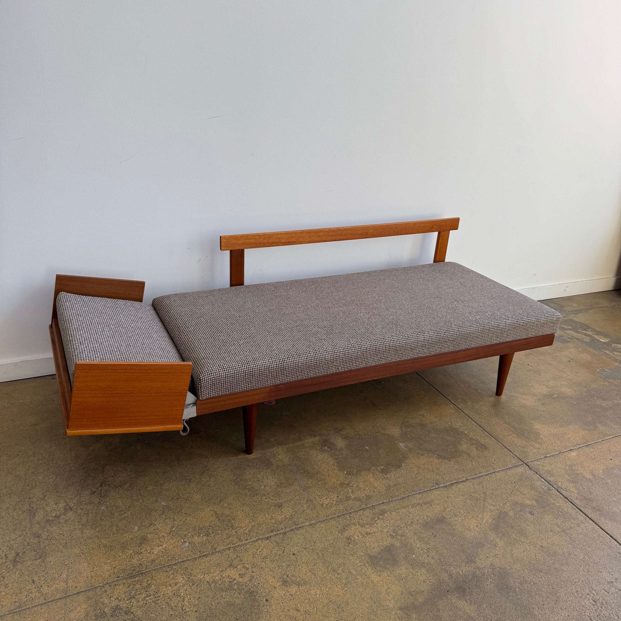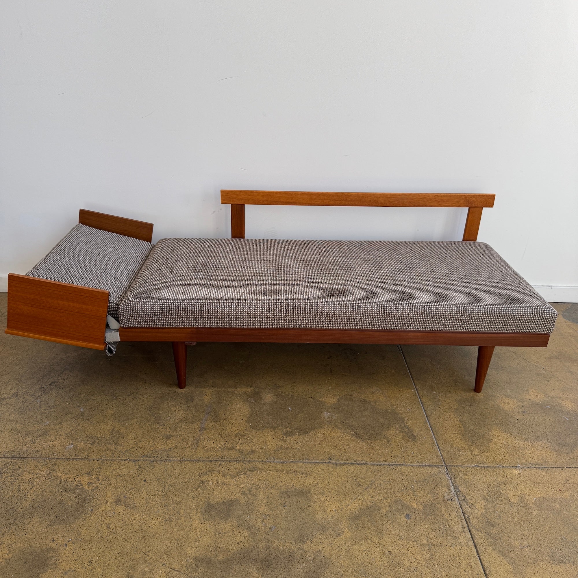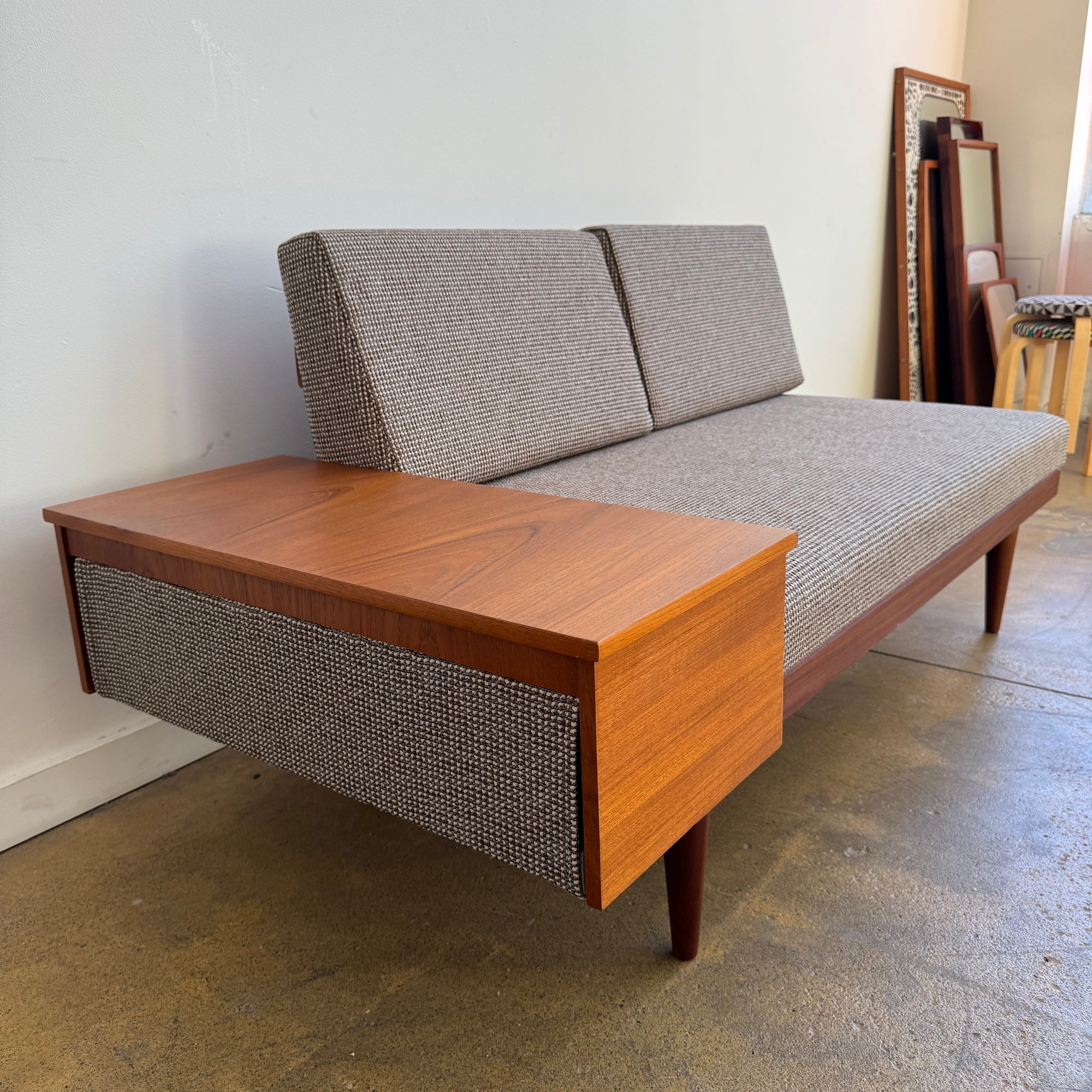 The integrated teak side table has been professionally refinished, showcasing a rich, even grain and warm tone. The daybed also features a clever fold-out mechanism that converts it from a compact sofa into a single bed. Hidden storage beneath the seat provides space for throws or pillows.