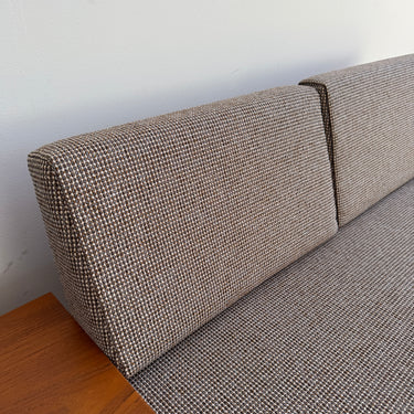 Recently reupholstered in a premium chunky tweed fabric by Designtex, offering both durability and texture. The frame is in excellent vintage condition with tight joinery and a beautiful patina.