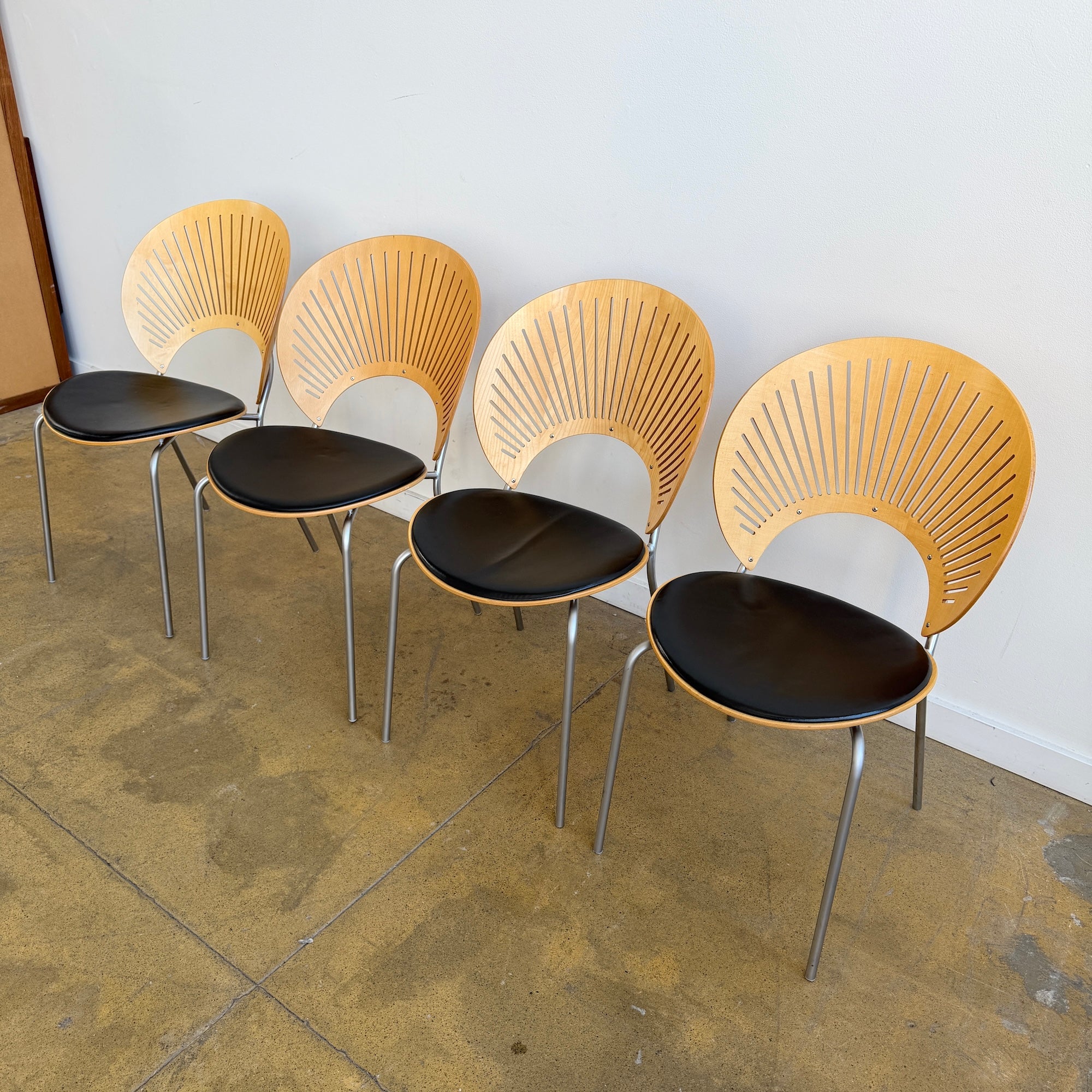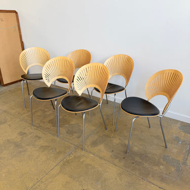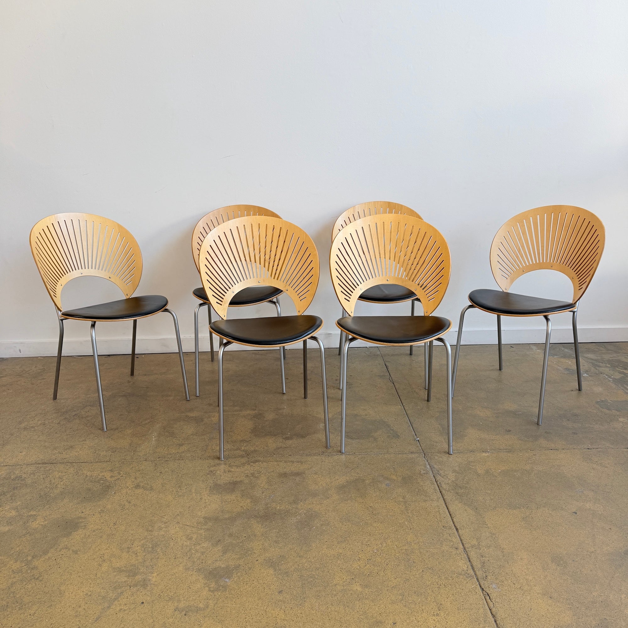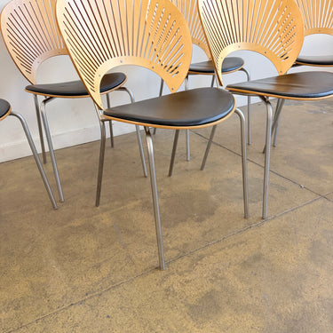 Designed by Nanna Ditzel, the Trinidad chair is one of the most celebrated Scandinavian dining chair designs of the late 20th century. Produced by Fredericia, the chair is instantly recognizable for its sculptural, fan-shaped laminated backrest with delicate cutouts inspired by Caribbean architecture. This set includes a total of six chairs, offering a balanced and architectural presence around a dining table. With their light visual profile, steel frames, and refined proportions, Trinidad chairs work beautifully in both modern and classic interiors.