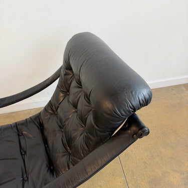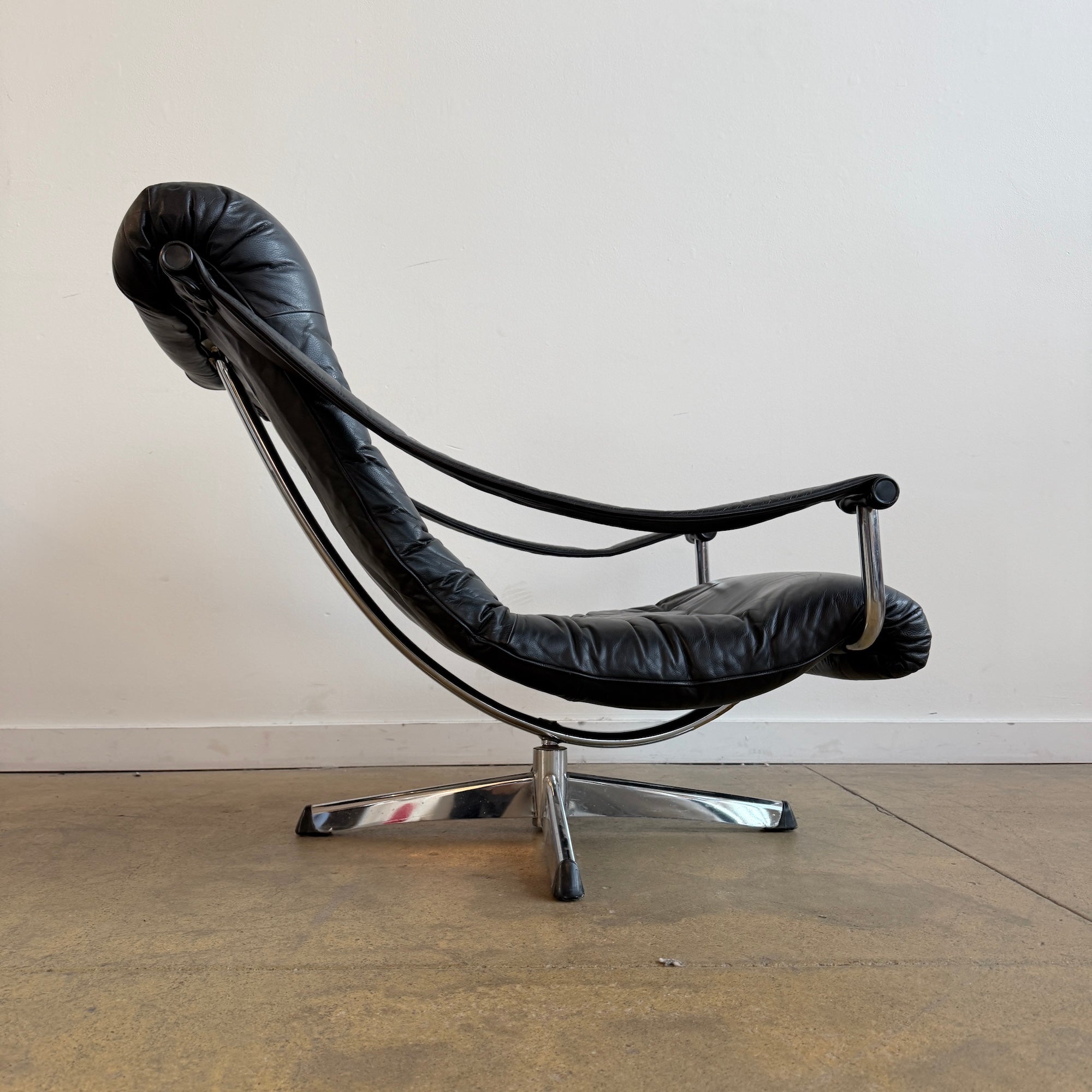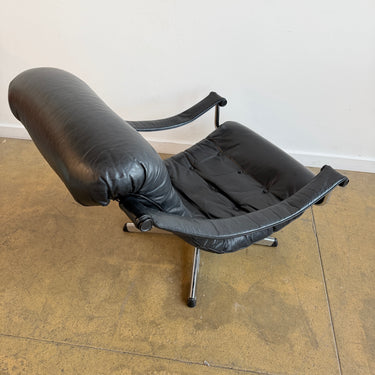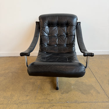 Elegant and comfortable Swedish swivel chair designed and produced by Göte Möbler Nässjö in the 1970s. The model “Lagun” features a tufted black leather seat with plush cushioning, curved arm supports wrapped in matching leather, and a polished chrome frame resting on a four-star swivel base. A timeless design that balances comfort with sculptural form.