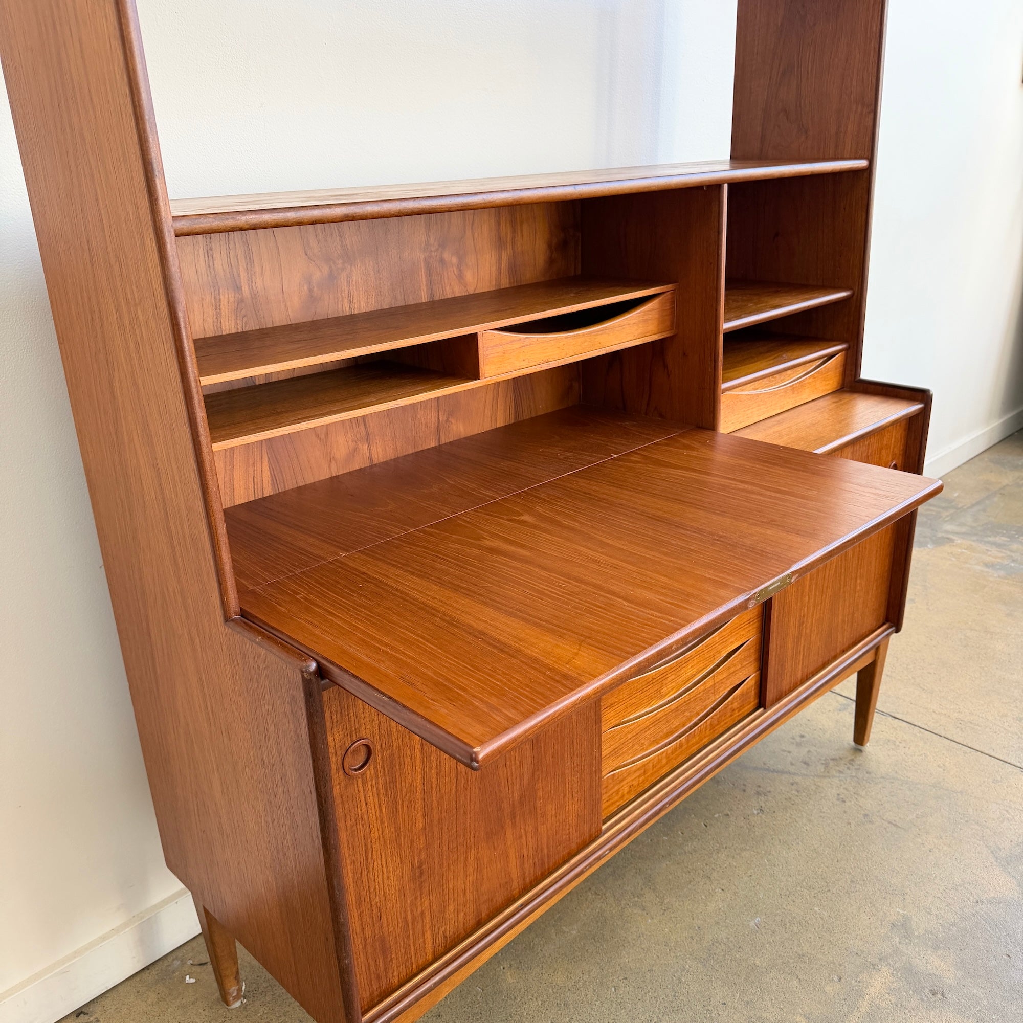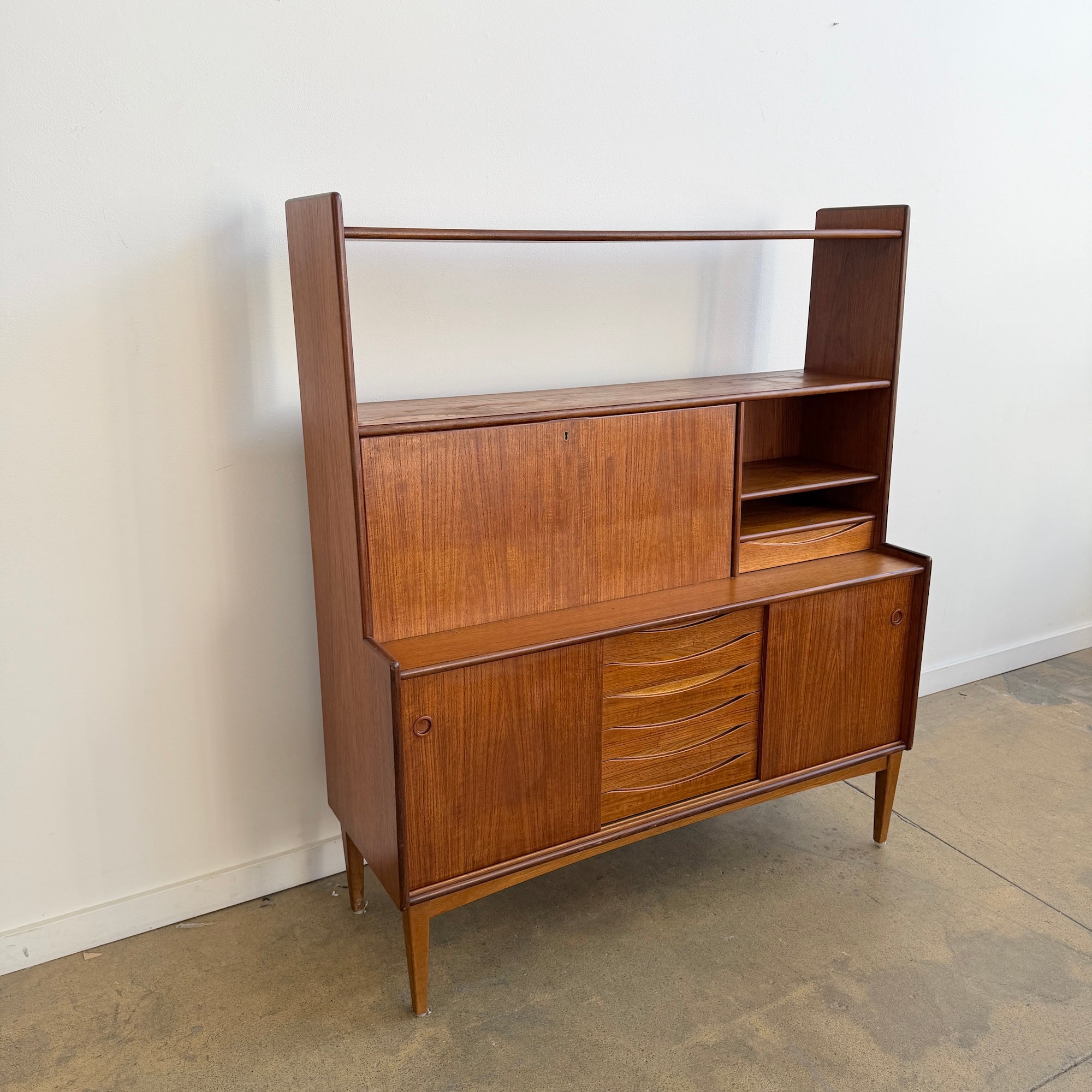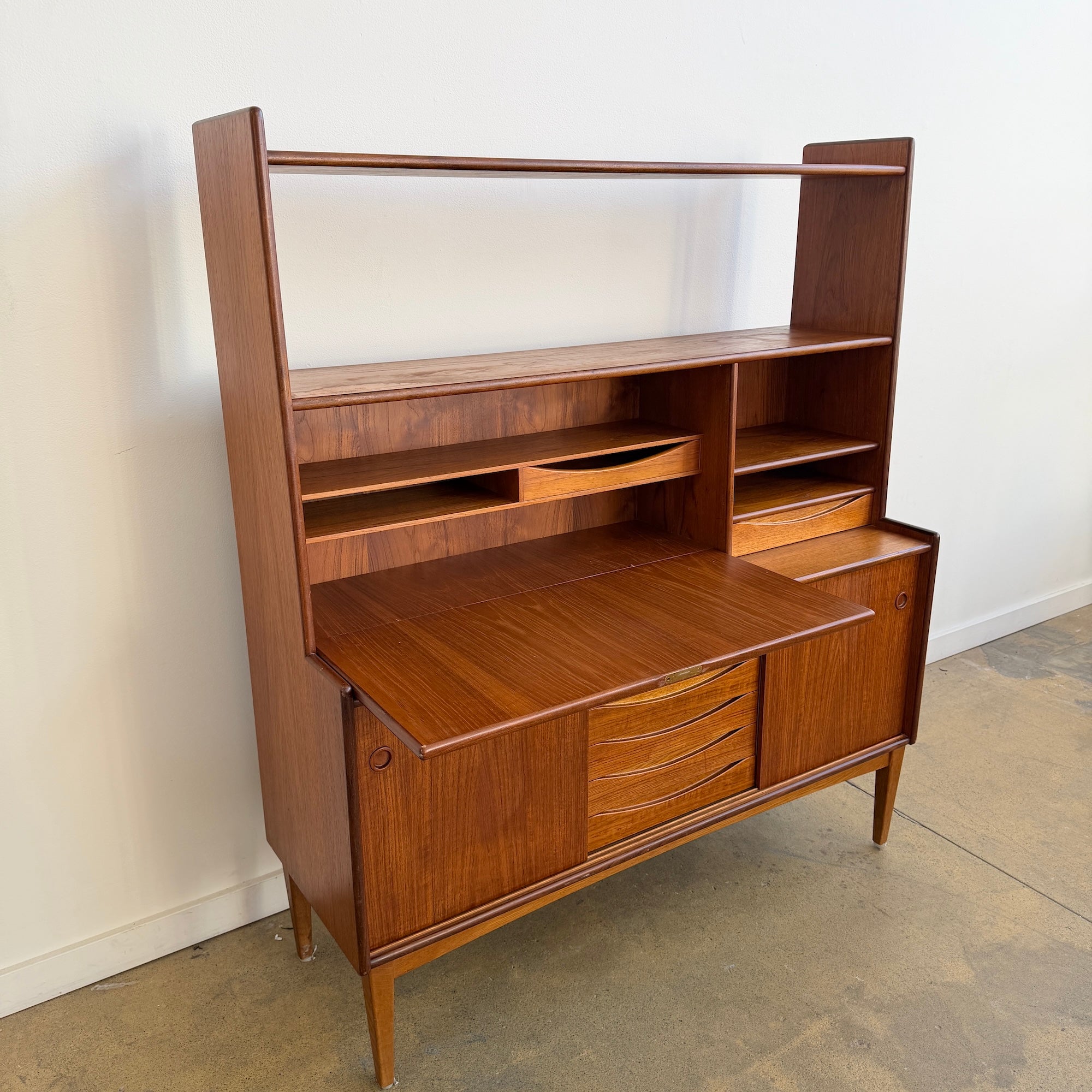 This versatile Scandinavian modern bookcase by Petterson & Nilson was produced in Sweden during the 1960s and crafted in warm, richly grained teak. The design combines open shelving with enclosed storage, featuring a drop-down door that converts into a functional secretary desk. Thoughtful details like sculpted drawer pulls, integrated cubbies, and balanced proportions make this a highly practical yet elegant storage piece, suitable for use as a bookcase, writing desk, or compact home office setup.
