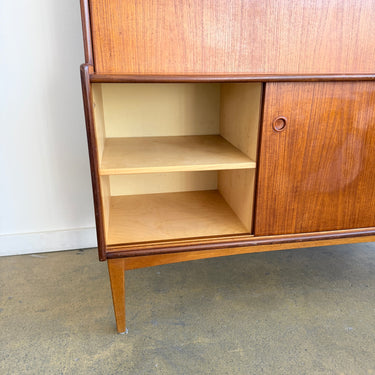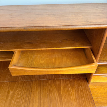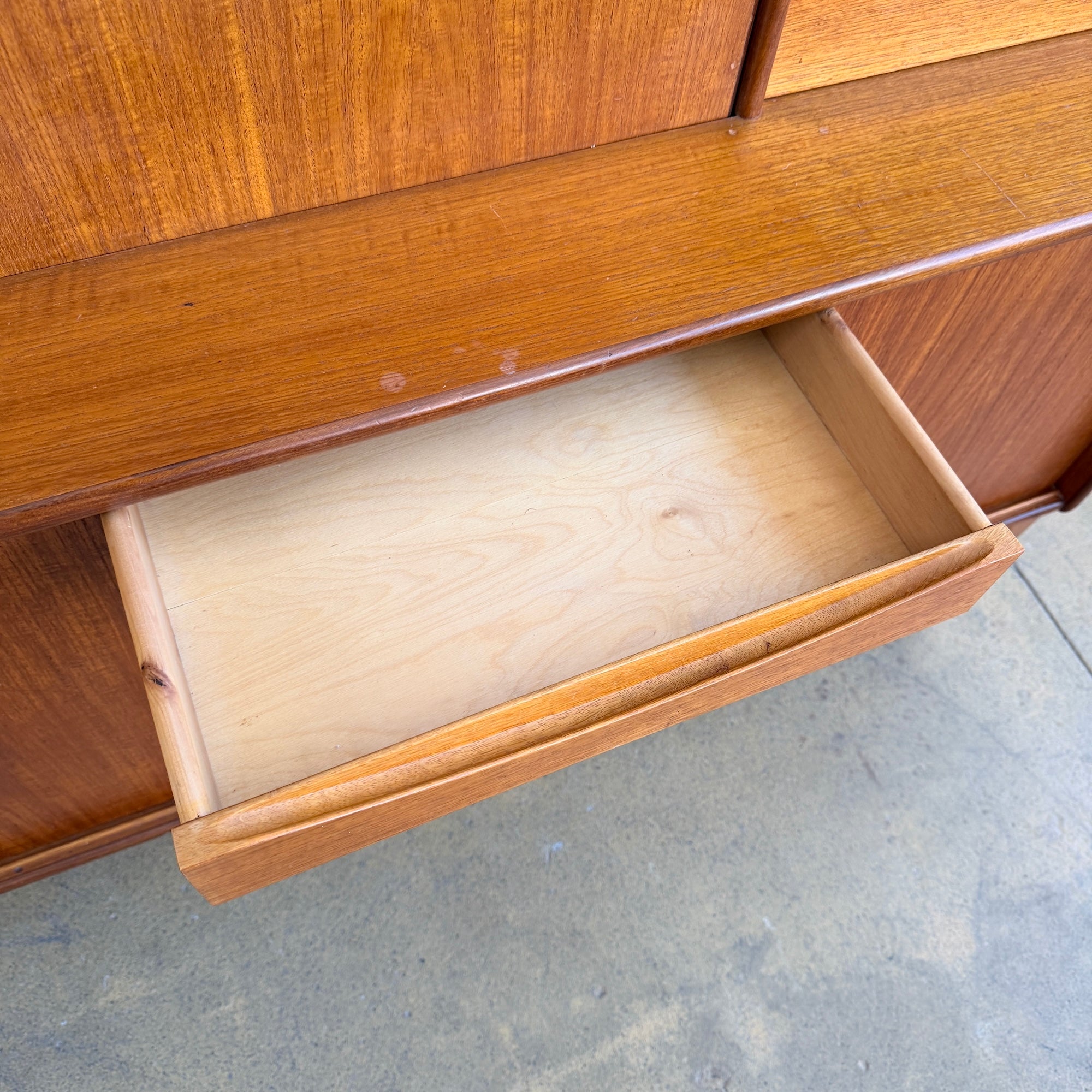 The piece is in good vintage condition, showing light, age-appropriate wear consistent with its era. The teak surfaces present well with a nice, even tone, and all doors and drawers function smoothly. No structural issues observed, making it a solid and ready-to-use example of mid-century Scandinavian cabinetry.