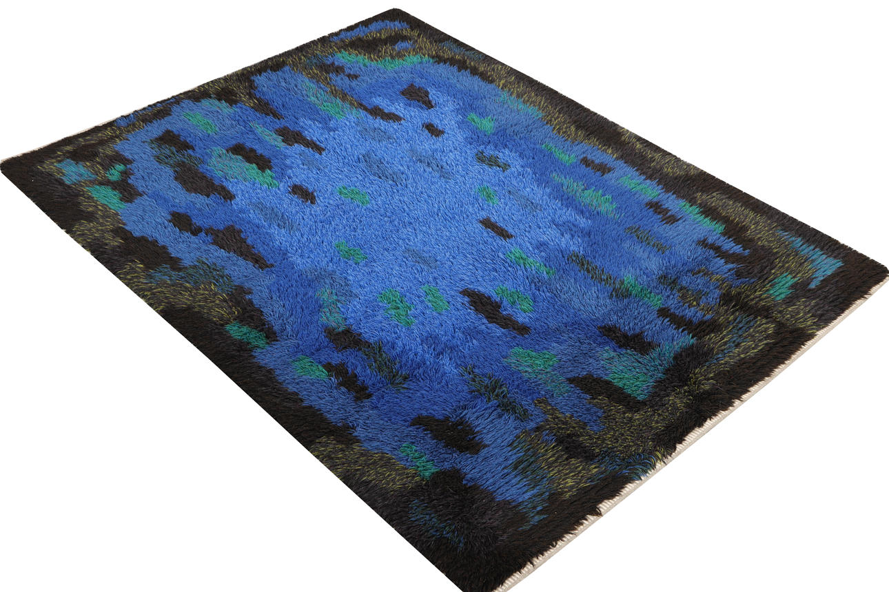 A dramatic Scandinavian Rya rug featuring deep cobalt blues layered with teal and charcoal accents. The long wool pile creates a lush, velvety surface, while the abstract pattern evokes shifting water, moonlit reflections, and tonal movement. The colors are vivid and saturated, giving the piece a striking presence without feeling overwhelming.