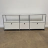 This USM Haller console is in excellent condition with no scuffs and scratches on the panels. There is three drop down doors. Casters on the bottom for easy moving.