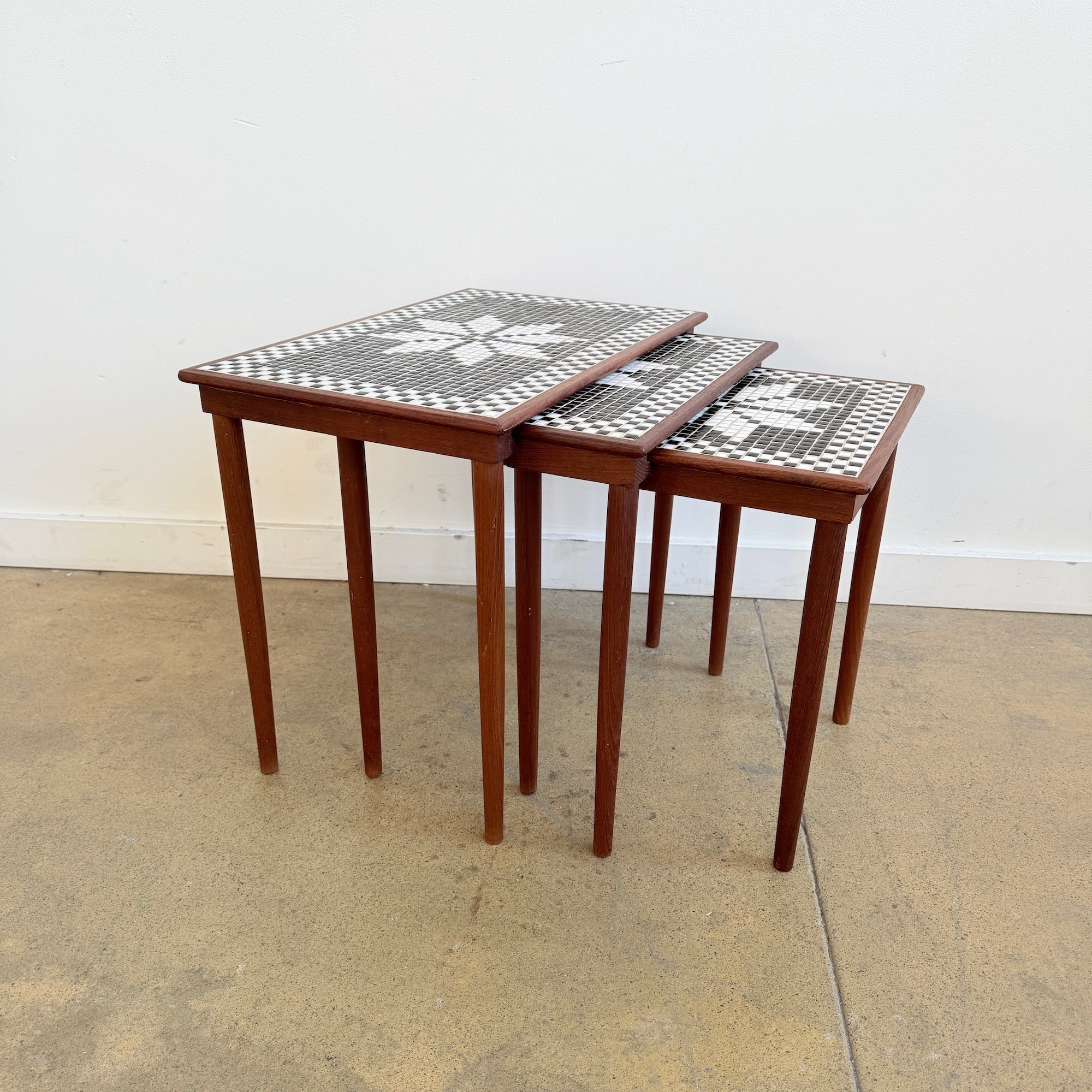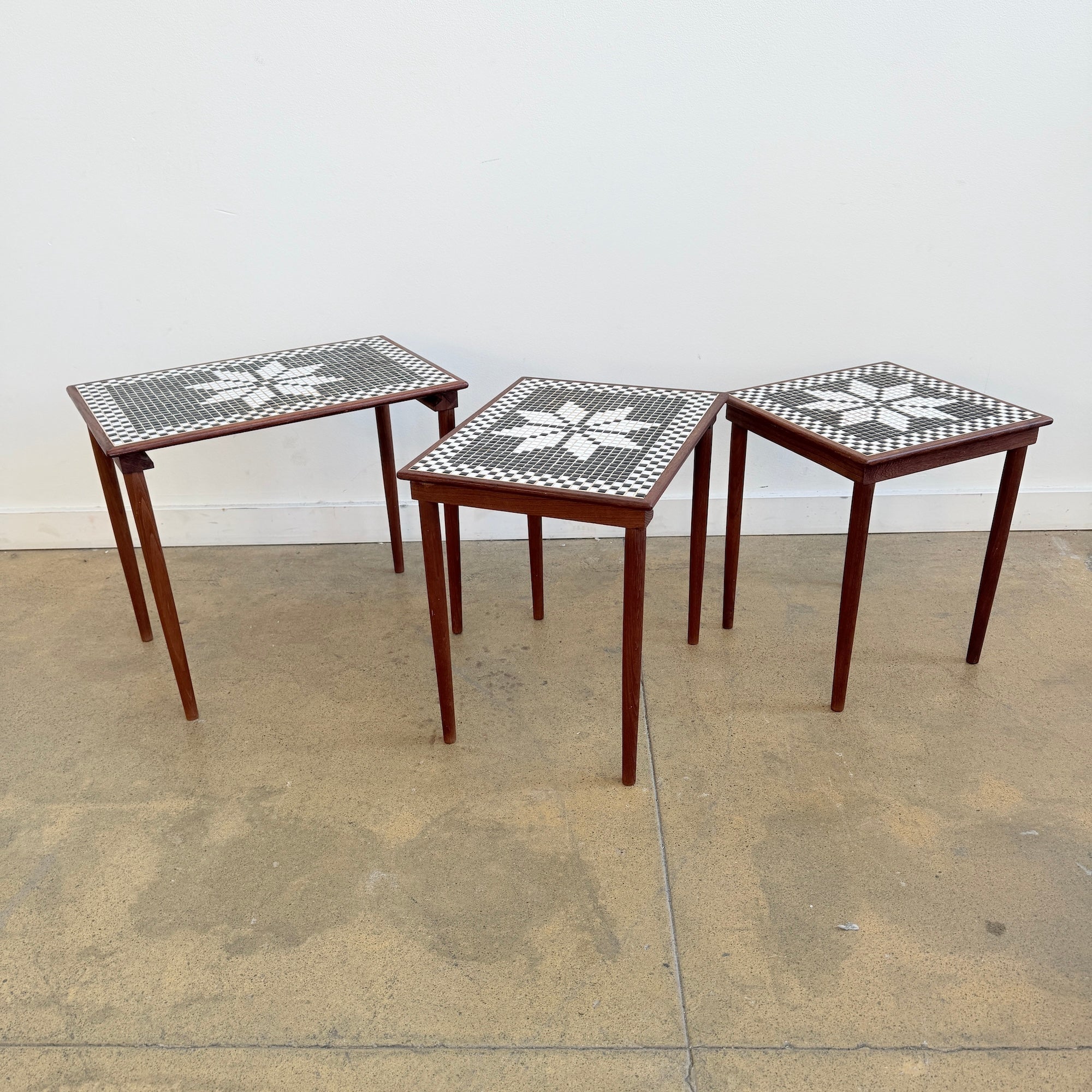 A beautiful set of three mid-century Danish nesting tables in teak with inlaid mosaic tile tops featuring a striking geometric floral pattern in black and white. The tables nest neatly under each other, offering versatile use as side tables or accent pieces.