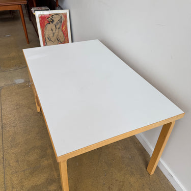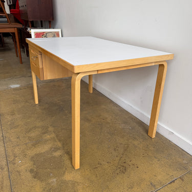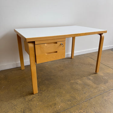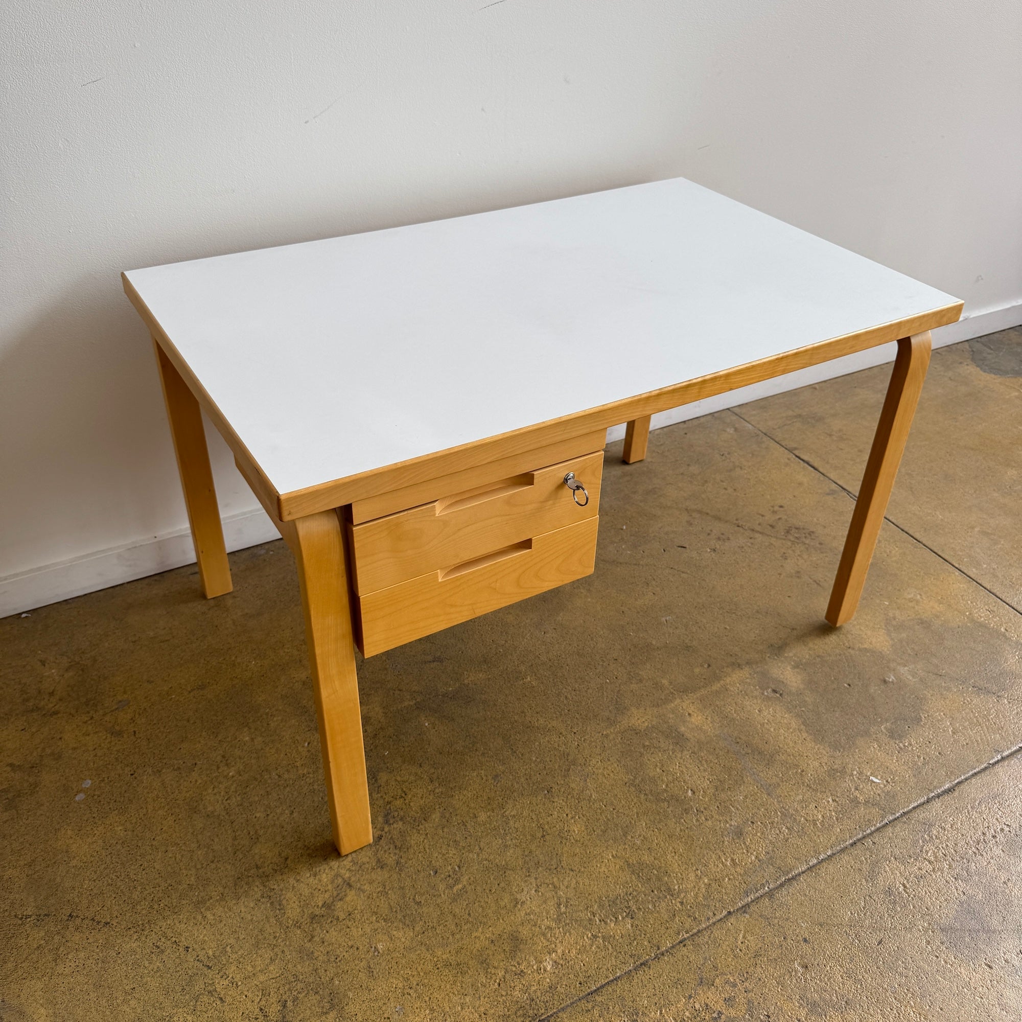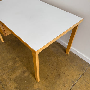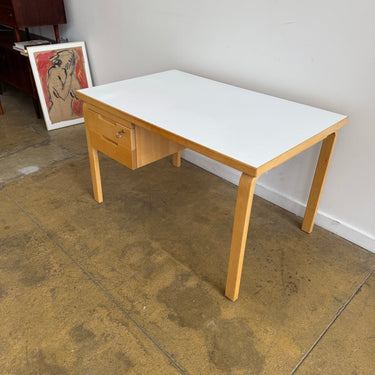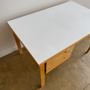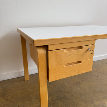 A rare minimalist desk by Alvar Aalto, featuring his iconic bent birch legs and a white laminate top. Clean lines meet warm natural tones in this timeless design. The desk includes two integrated drawers—one with a working lock—and comes with the original key. A perfect blend of function and form, this piece exemplifies Aalto’s signature Scandinavian modern style. Drawers can be shifted both left and right.