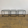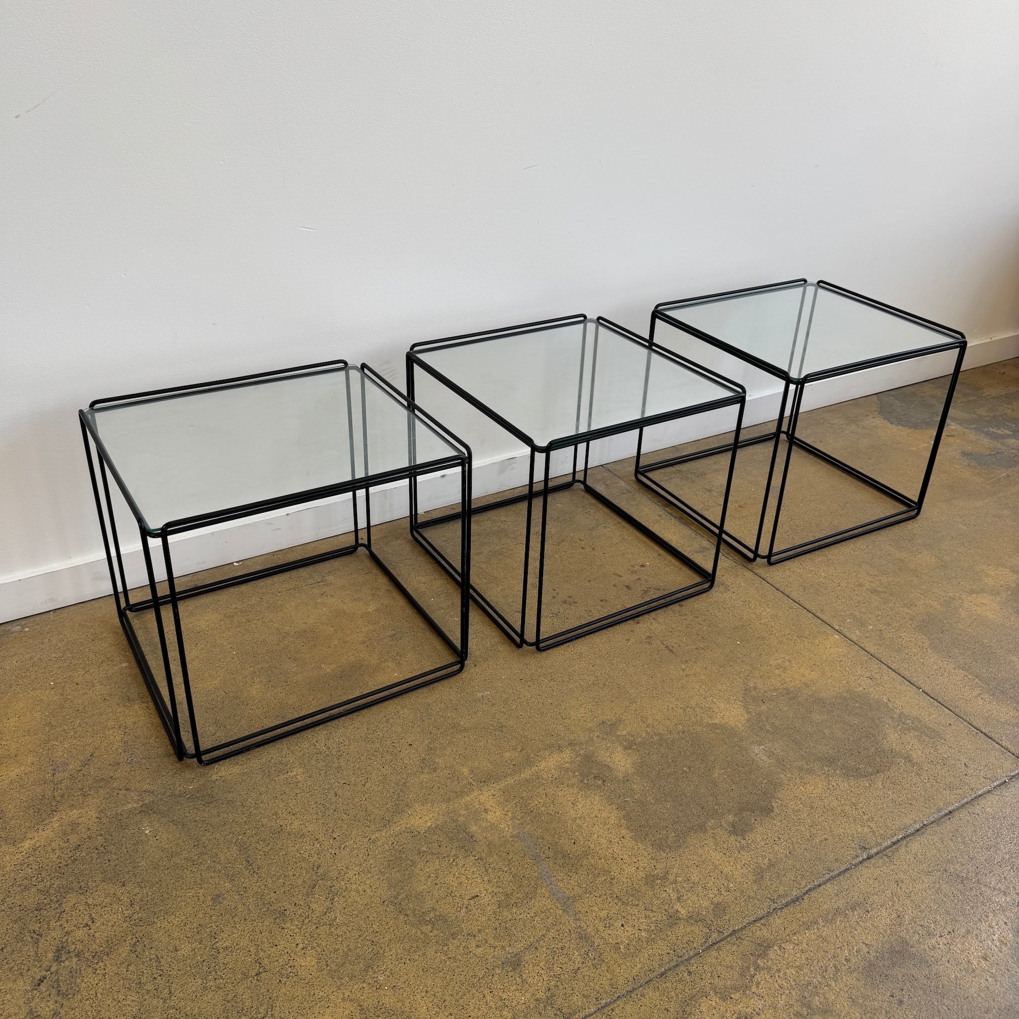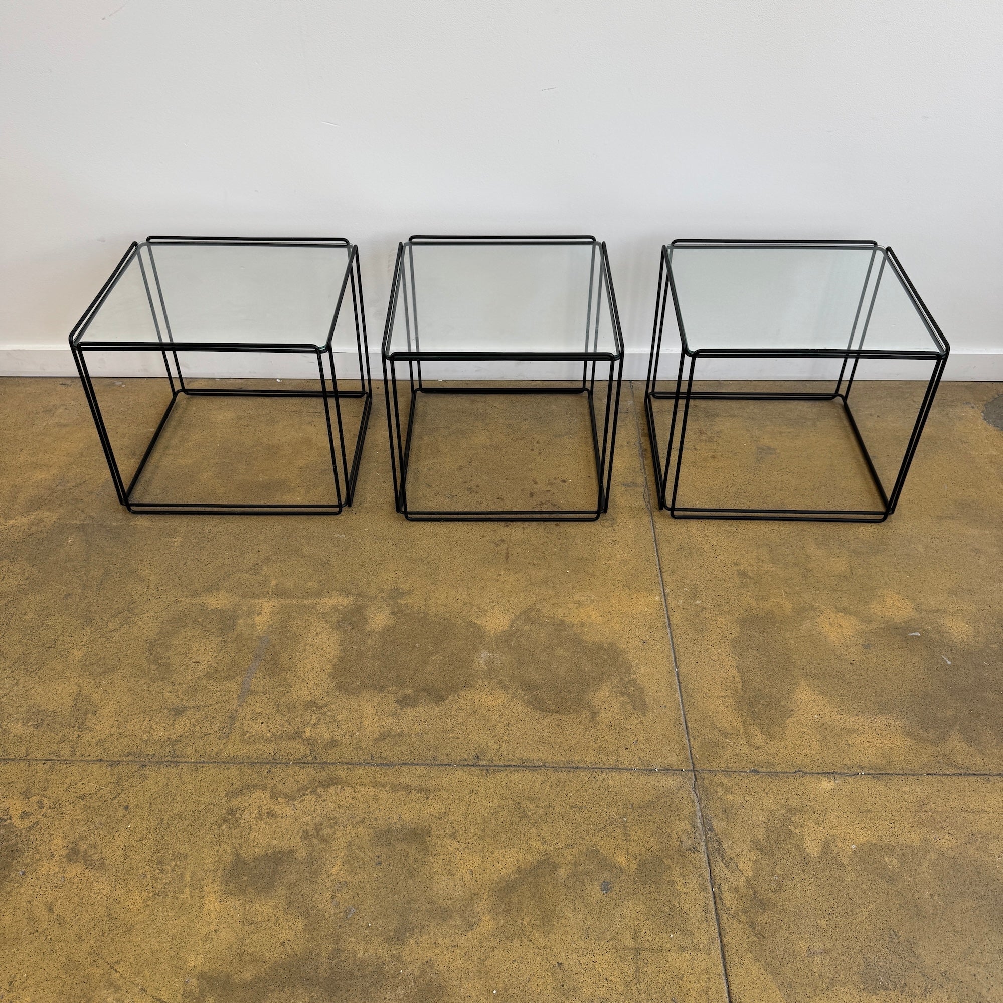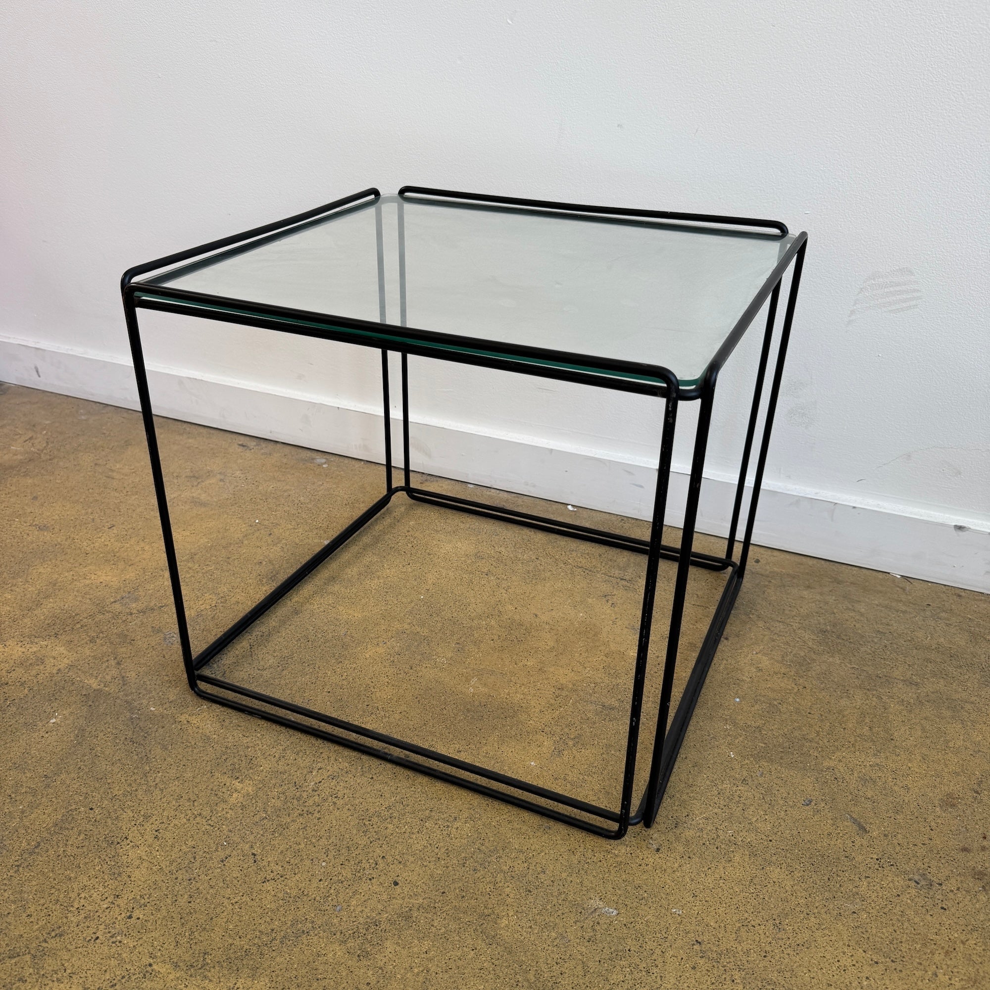 The Max Sauze 'Isosceles' end table features a glass top and a distinctive graphic line art design, crafted by Atrow. While the glass top may not be original, the frame remains in good condition with minor surface marks. The glass surfaces show some scratches, reflecting typical wear.