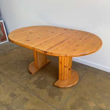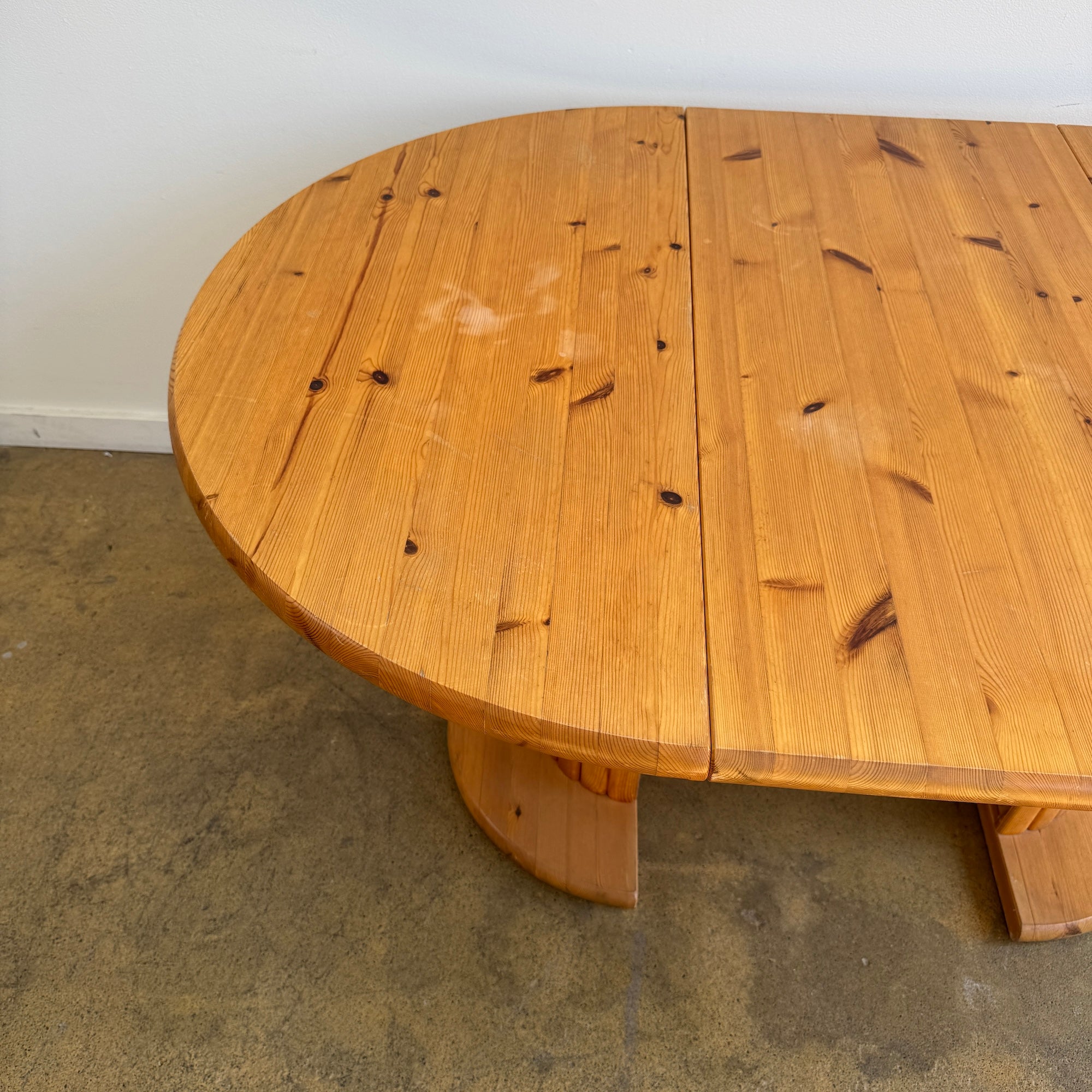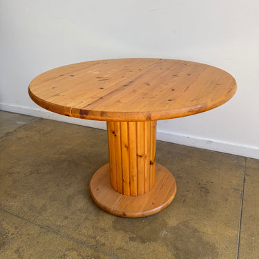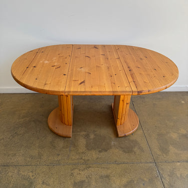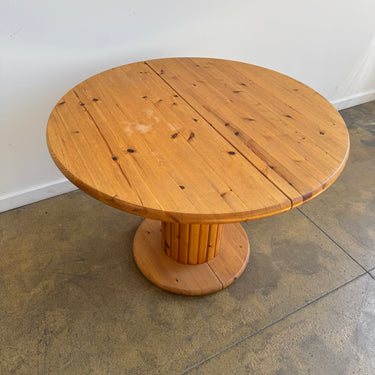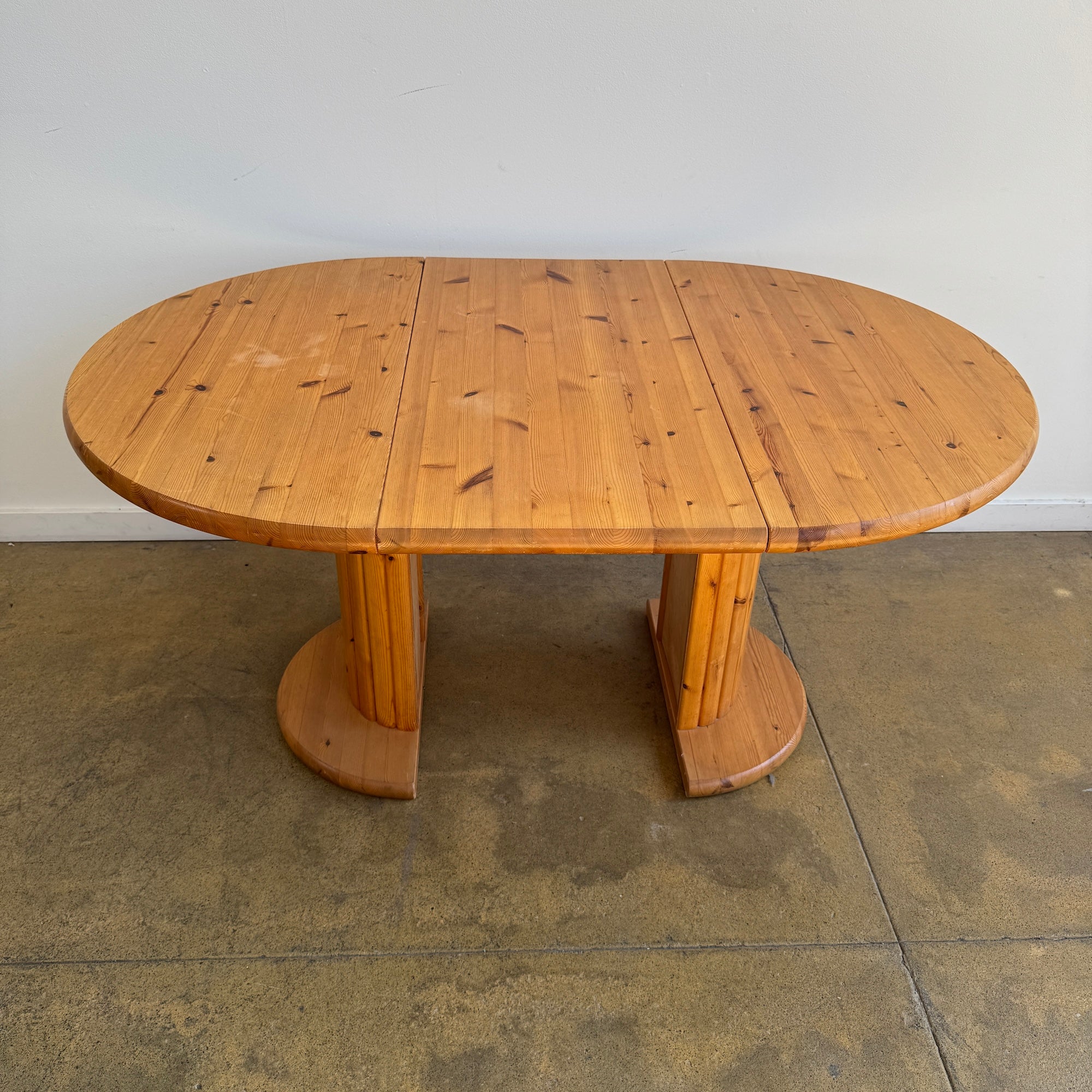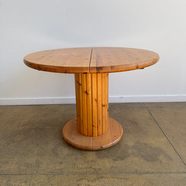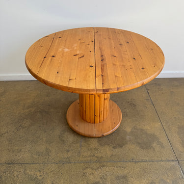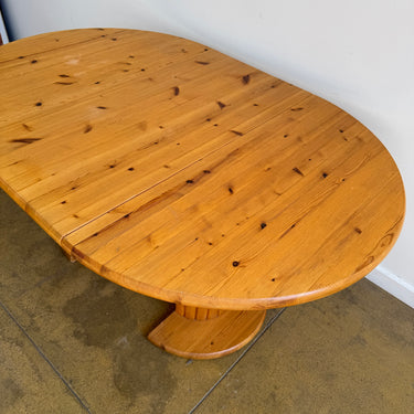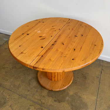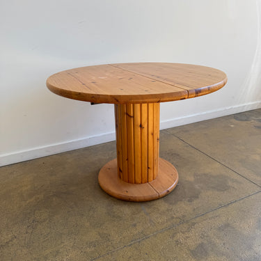 Round extendable dining table, designed in the 1970s. Crafted from solid pine, the table expands for extra seating or stays round to save space. This is crafted with solid pinewood that will last decades not cheap pine. There are some light scuffs here and there. Table has a tiny heat mark that is not very noticeable.