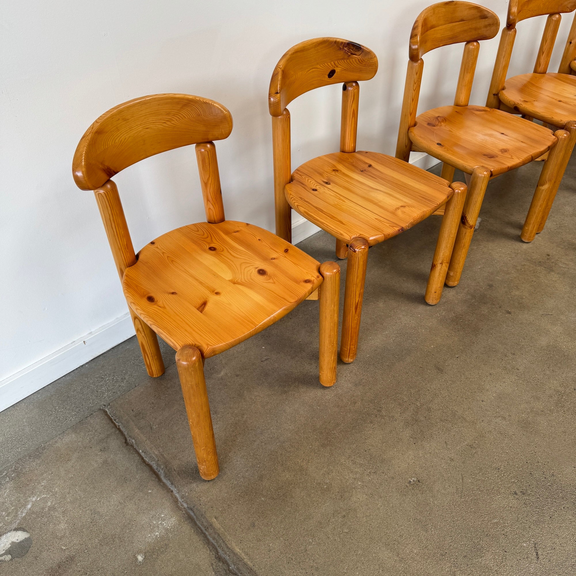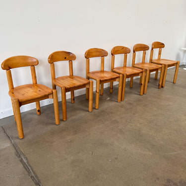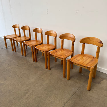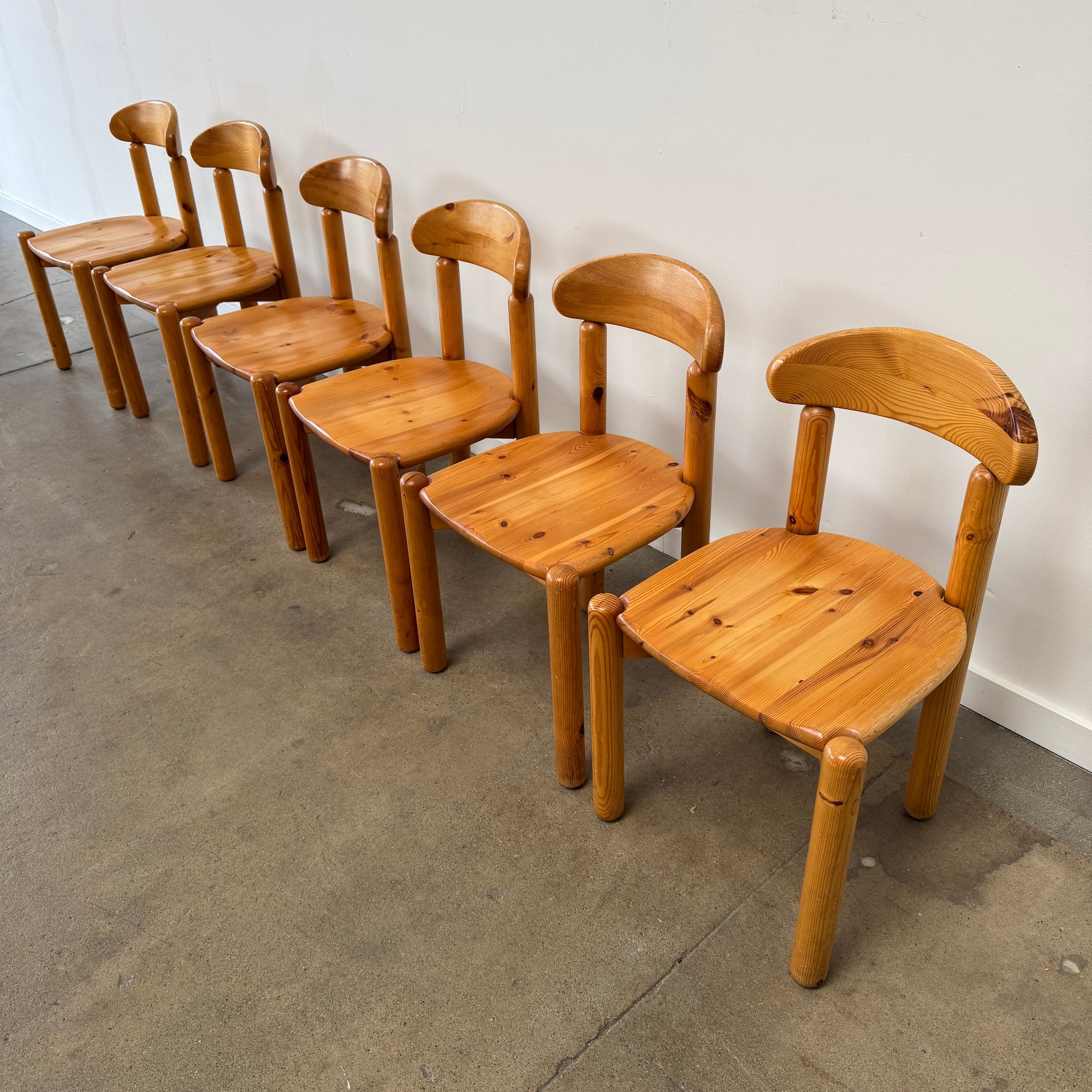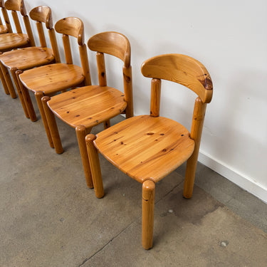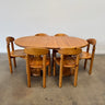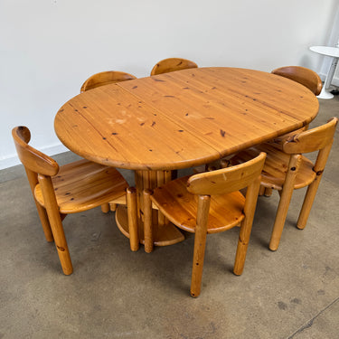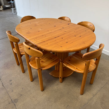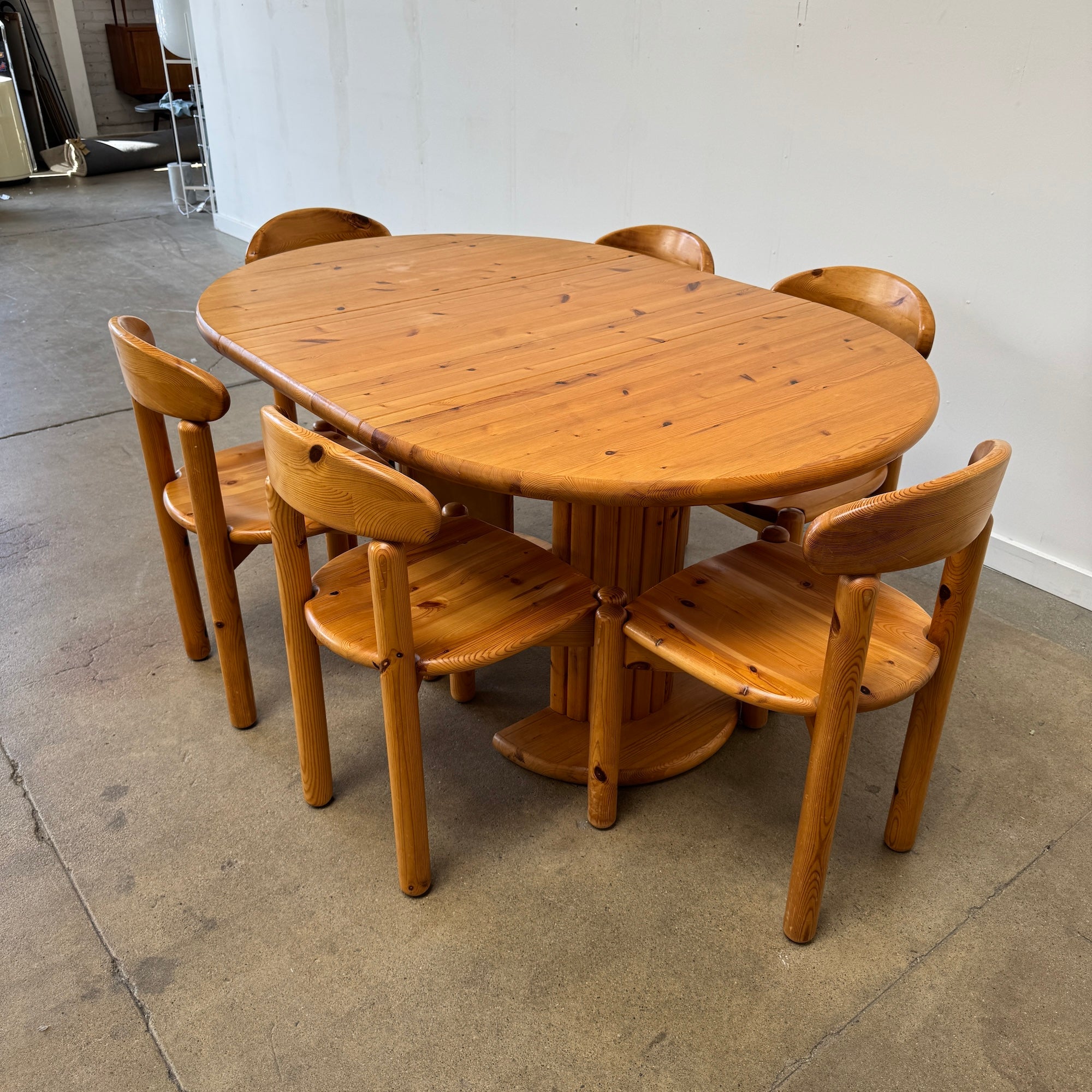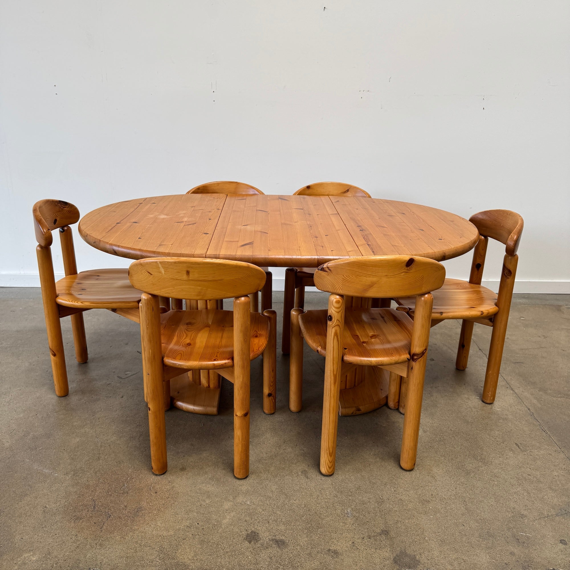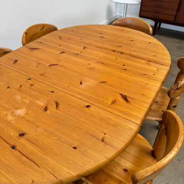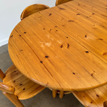 Set of six dining chairs and a round extendable dining table, designed in the 1970s. Crafted from solid pine, the table expands for extra seating or stays round to save space. Price includes both the table and chairs. This is crafted with solid pinewood that will last decades not cheap pine. There are some light scuffs here and there. Table has a tiny heat mark that is not very noticeable.