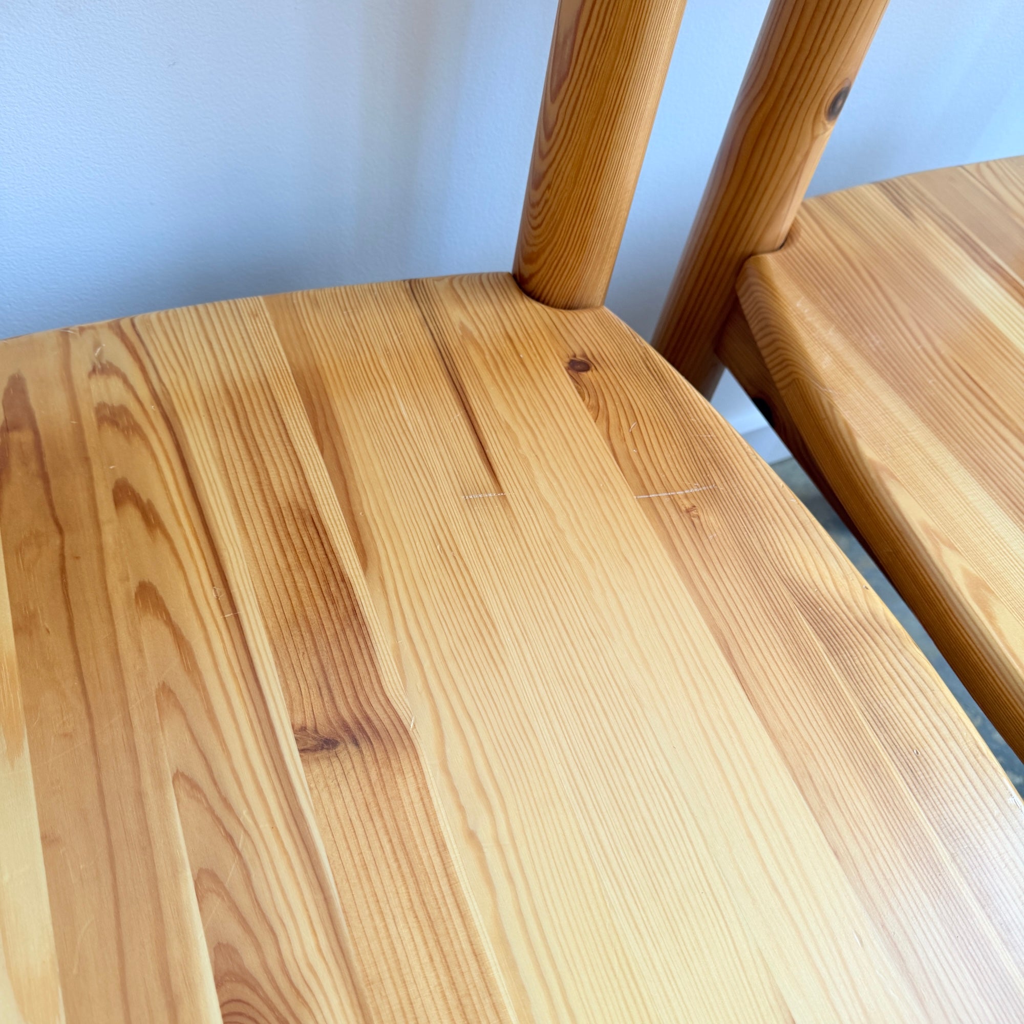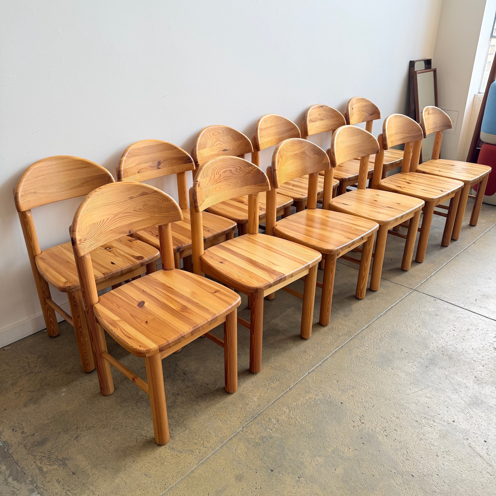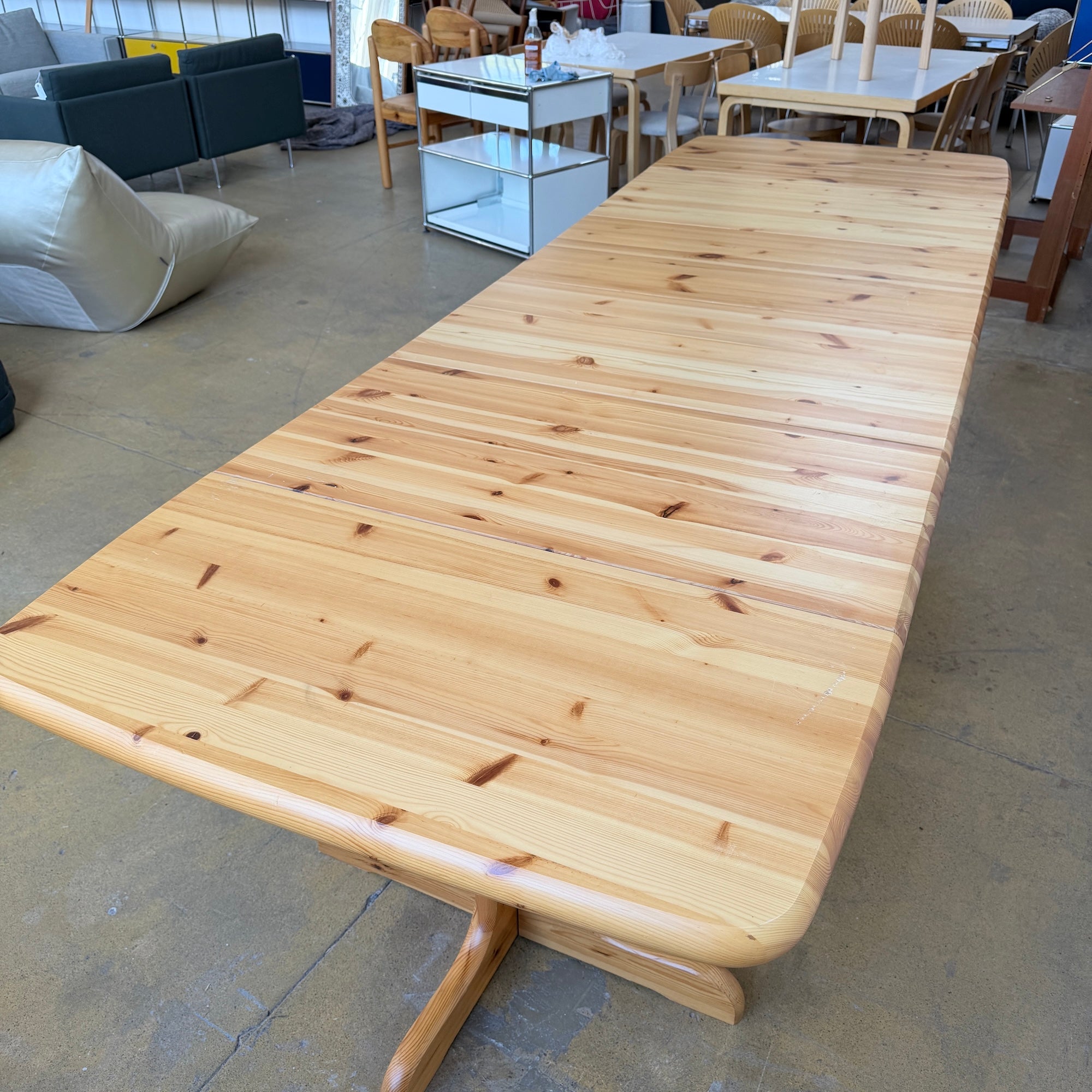 Accompanied by 12 matching chairs with half-moon curved backrests and solid pine seats, all showcasing the natural grain and warm golden tone typical of Scandinavian pine craftsmanship. Good vintage condition with light wear consistent with age and use. Some light scuffs here and there. Otherwise in really good condition structurally. As a Set you save around $1650.