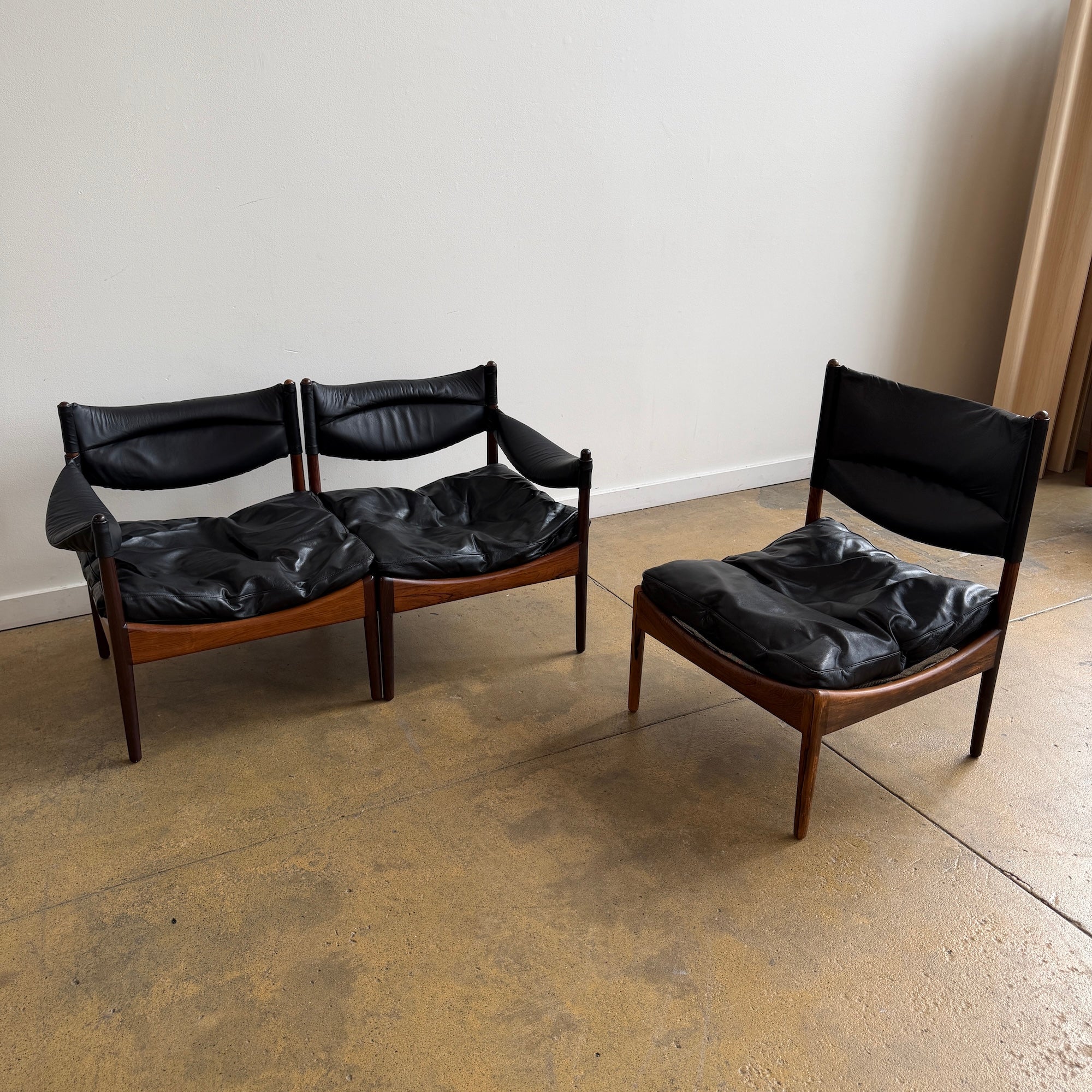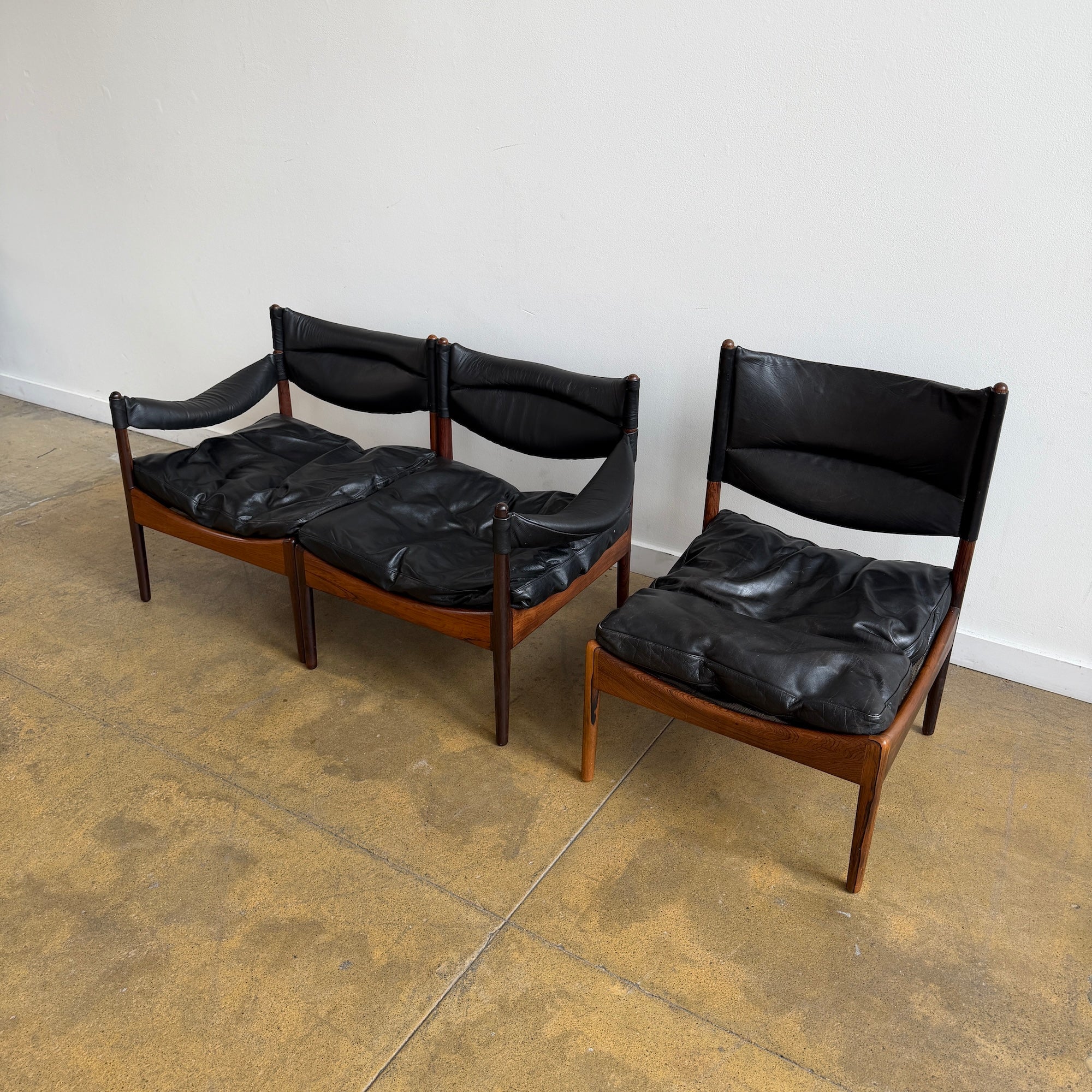 Designed in 1963, the Modus series showcases Vedel’s modular approach with sculptural rosewood frames and supple black leather cushions. The rosewood grain is rich and well defined, paired with soft leather that shows light wear consistent with age.