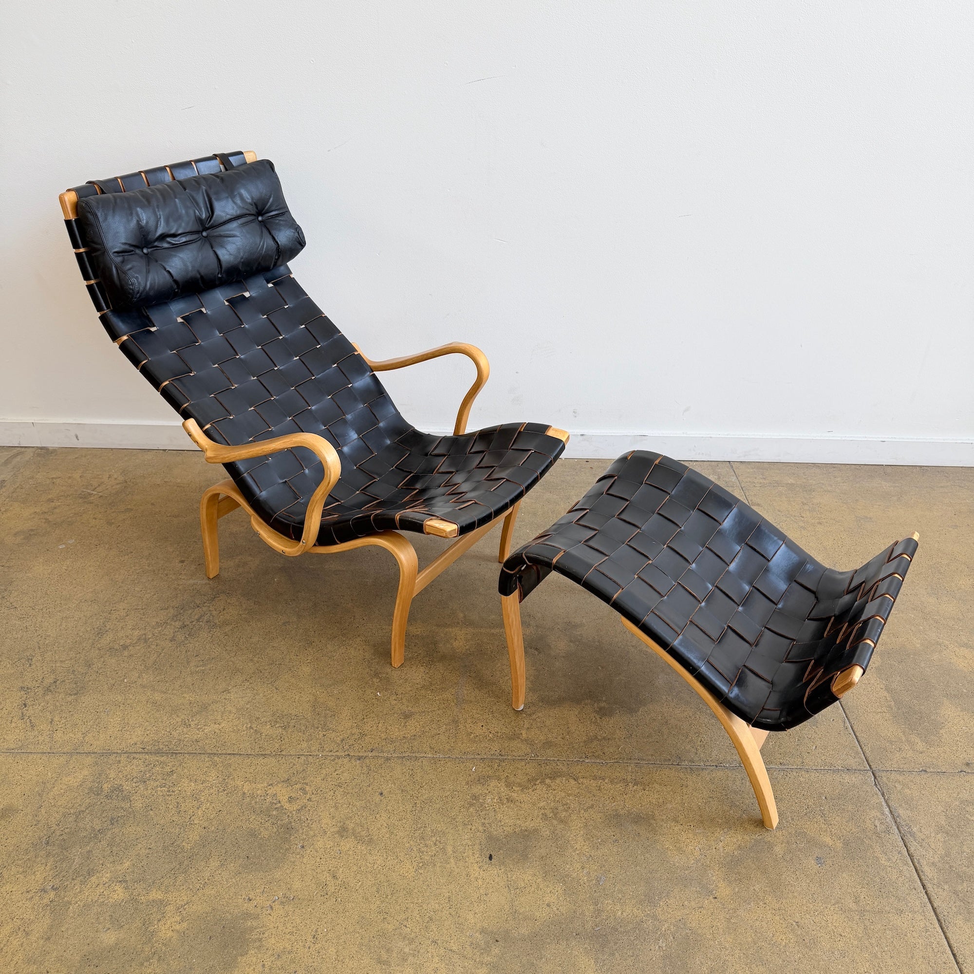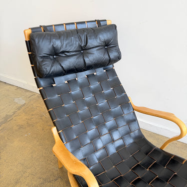 Bruno Mathsson “Pernilla” Armchair with Ottoman for Karl Mathsson, Sweden, 1973. A classic Scandinavian lounge design featuring a laminated beech frame with beautifully shaped arms and hand-braided black leather webbing, paired with its original loose leather head cushion. The woven leather is done in high-grade hide that softens and develops rich character over time. Frame is solid with light, honest wear. Leather shows minor scuffs consistent with age but remains supple and strong. A rare early example with matching stool.