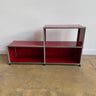 A versatile USM Haller unit in striking ruby red finish with chrome frame. Compact and shallow at only 10" deep, making it ideal for an entryway, hallway, or small-space storage. Features a stepped two-level design with open shelving for books, shoes, or display pieces. Excellent condition.