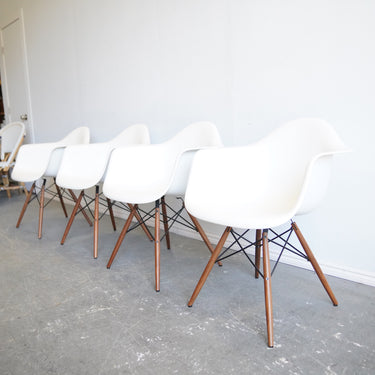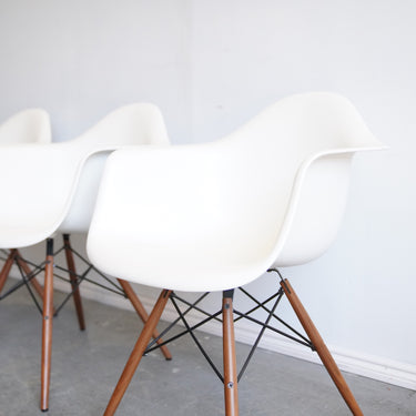 Modern classic — Offering a cradle of comfort, the Eames Molded Plastic Armchair provides just the right amount of give, with a deep seat pocket and waterfall seat edge to reduce pressure on the backs of thighs.