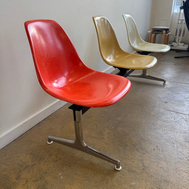 This particular configuration features three fiberglass shell chairs in a stunning red, beige, and neutral. mounted on a sturdy black beam with polished aluminum legs. In good vintage condition. The middle shell chair is a vintage piece from 1980's and have slightly more wear and patina. Overall in good condition.