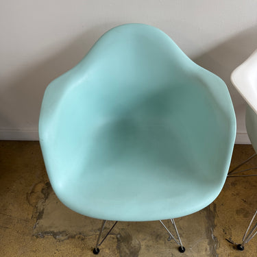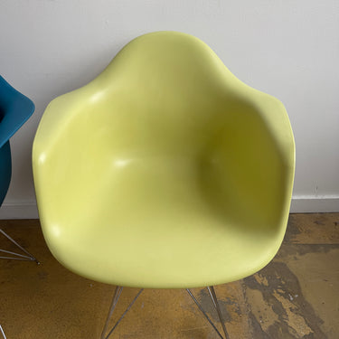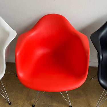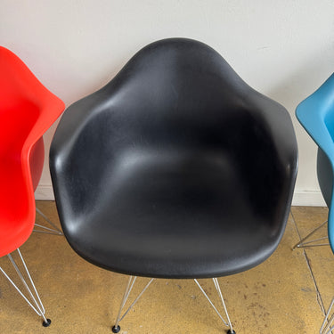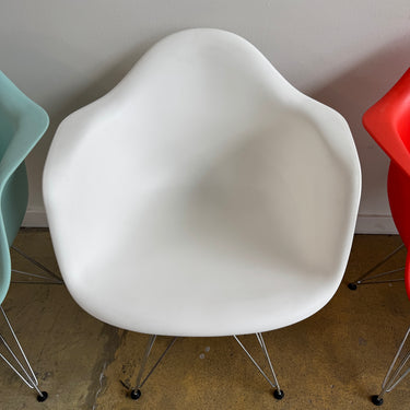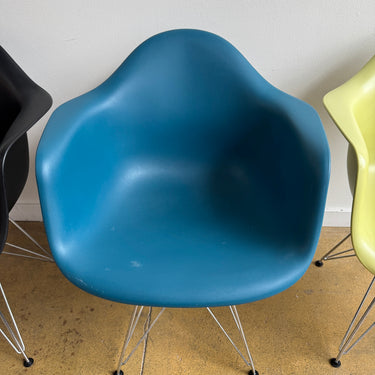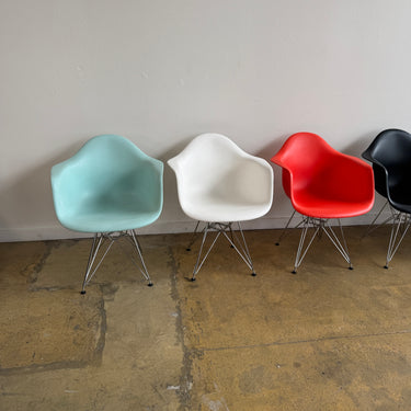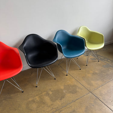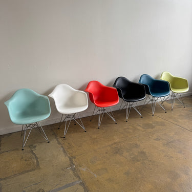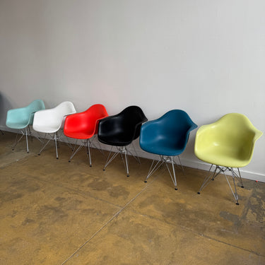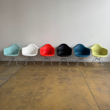 We have 6 different color authentic Herman Miller Eames side chairs with wire base. Some light scuffs here and there. Nothing major. Overall in good used condition.