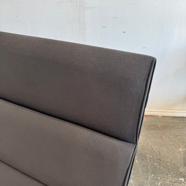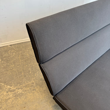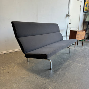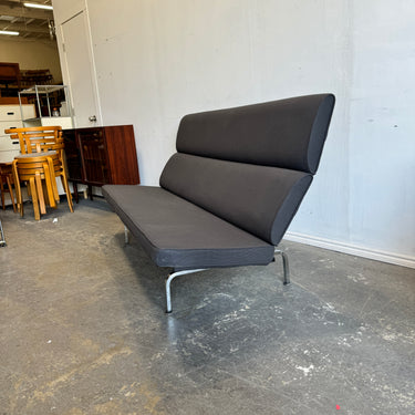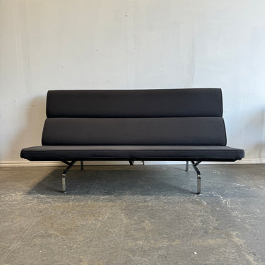 The inspiration for the Eames Sofa Compact (1954) derived from a built-in sofa designers Charles and Ray Eames designed in the late 1940s for their home in Pacific Palisades, California. They liked that sofa so much, they decided to develop a freestanding version built on an airy pedestal of chromed-steel legs. With plush foam cushions supported by resilient webbing, it offers firm but flexible all-around comfort. This is an authentic Eames product by Herman Miller.