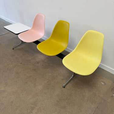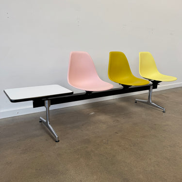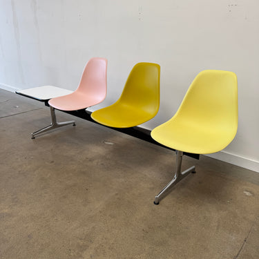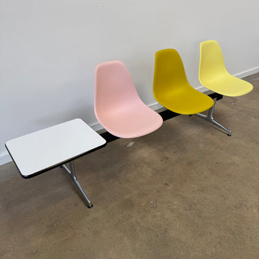 This particular configuration features three shell chairs in a stunning tricolor combination (yellow, gray, and orange), mounted on a sturdy black beam with polished aluminum legs. The addition of a white laminate side table enhances its versatility, making it perfect for both residential and commercial spaces. In good vintage condition. Produced by Vitra. We have several other color shell chair that we can replace to complete your desire color. Red, black, blue, white, and orange available.