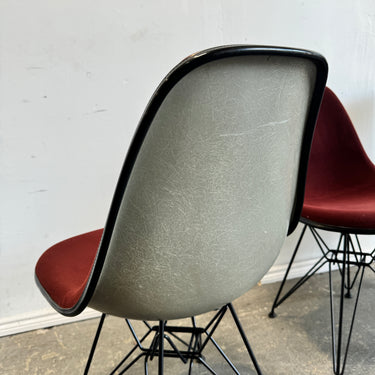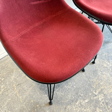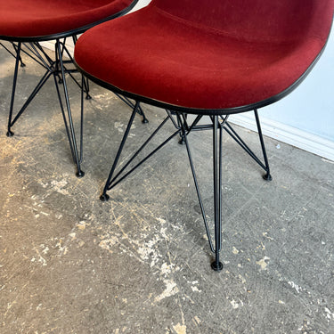 This is a rare authentic Eames produced by Vitra with velvet upholstery and fiberglass shell with Eiffel base. Some light scuffs here and there. Overall in really good condition.
