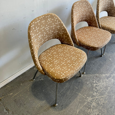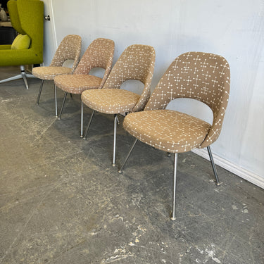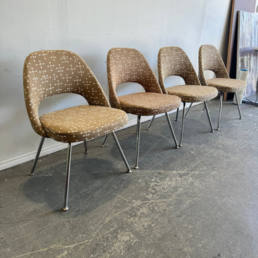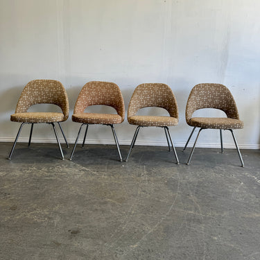 Note: In good condition set of 4 authentic Knoll Saarinen chairs with Eames fabric. One chair appears to have a slightly darker fabric but barely noticeable.