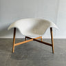Lounge chair with medium backrest. Fiberglass and oak. Construction of cylindrical legs and X-form stretcher or swivelling pillar underframe.