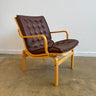 A stylish and comfortable lounge set featuring two Albert Chairs Model 4100 designed by Finn Østergaard for Skipper Furniture, Denmark. These Danish modern chairs showcase a beautifully curved laminated beechwood frame paired with plush, button-tufted leather cushions in a rich brown tone. The ergonomic design ensures excellent support while maintaining a sleek and airy aesthetic. Complementing the chairs is a matching round beechwood coffee table, creating a cohesive and inviting setup. Two chairs and matching coffee table available. Price is for only one chair.