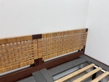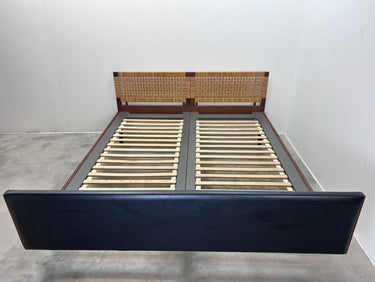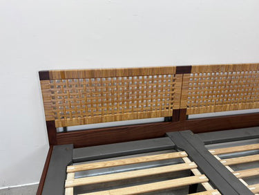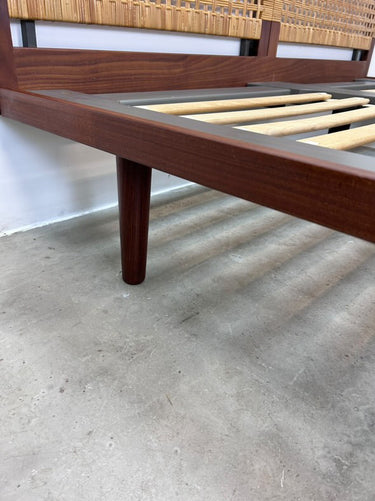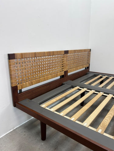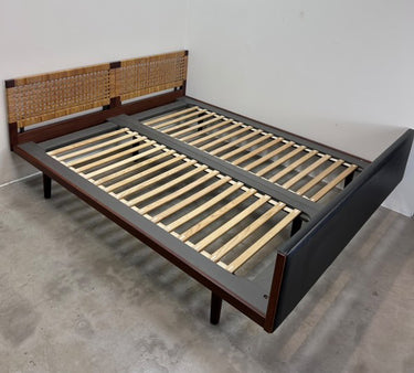 A beautifully preserved vintage teak bed designed by Hans Wegner for GETAMA, Denmark. This rare Danish modern piece showcases Wegner’s signature attention to detail and craftsmanship. The headboard features a striking woven cane panel set within a rich teak frame, giving the bed an elegant and airy aesthetic. The footboard is upholstered in sleek black leather, adding contrast and sophistication. Sturdy wood slats provide excellent support. This is queen bed and will work with queen mattress.