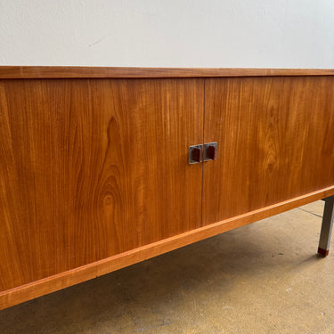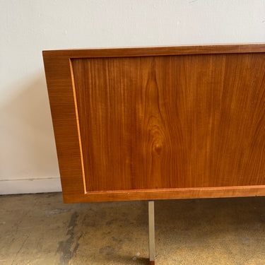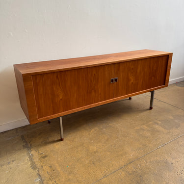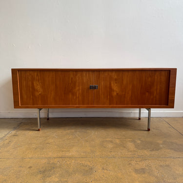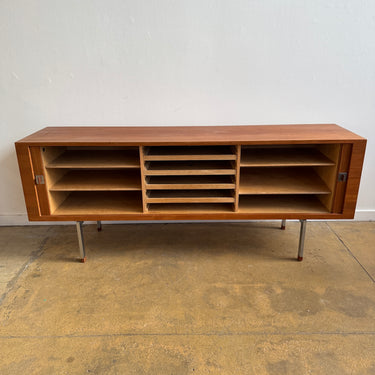 Elegant President Credenza in teak, designed by Hans Wegner and crafted in Denmark by Ry Møbler. This stunning piece showcases Wegner’s signature craftsmanship, featuring smooth sliding tambour doors with teak and chrome pulls, all resting on elegant tapered teak legs. The oak-lined interior is thoughtfully designed with four adjustable dovetailed pullout trays and four adjustable shelves (three pictured), offering both style and functionality.