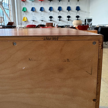 Stamped with a 1963 production mark, this credenza is a rare find—few pieces still carry their original date, adding to its authenticity and historical significance.