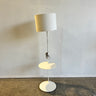 Lamp and table come together in a stunning and functional union. A slender yet substantial steel beam allows a linen shade to hover above a round steel cantilevered tabletop and base.
