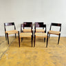 This set includes six chairs designed by Arne Hovmand Olsen and manufactured at Mogens Kold. Each chair features newly braided paper cord on a solid rosewood frame. Some light scuffs on the wood frame. Nothing major. Cordings are in pristine condition.