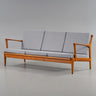 A beautifully sculpted mid-century modern 3-seater sofa designed by Bertil Fridhagen and produced by Bröderna Andersson in Sweden during the 1960s. This model, known as "Kuba," features an elegantly contoured solid teak frame with floating backrest construction and delicately tapered legs. The armrests showcase the signature organic curves Fridhagen is known for. Retains its original grey wool upholstery, clean and well-kept.