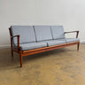 A beautifully sculpted mid-century modern 3-seater sofa designed by Bertil Fridhagen and produced by Bröderna Andersson in Sweden during the 1960s. This model, known as "Kuba," features an elegantly contoured solid teak frame with floating backrest construction and delicately tapered legs. The armrests showcase the signature organic curves Fridhagen is known for. Retains its original grey wool upholstery, clean and well-kept.