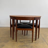 This Mid-Century Danish Modern dining set by Hans Olsen for Frem Røjle (1950s) blends smart design with timeless style. The teak table features a built-in butterfly leaf, and four sculpted three-legged chairs tuck neatly underneath for a compact look.